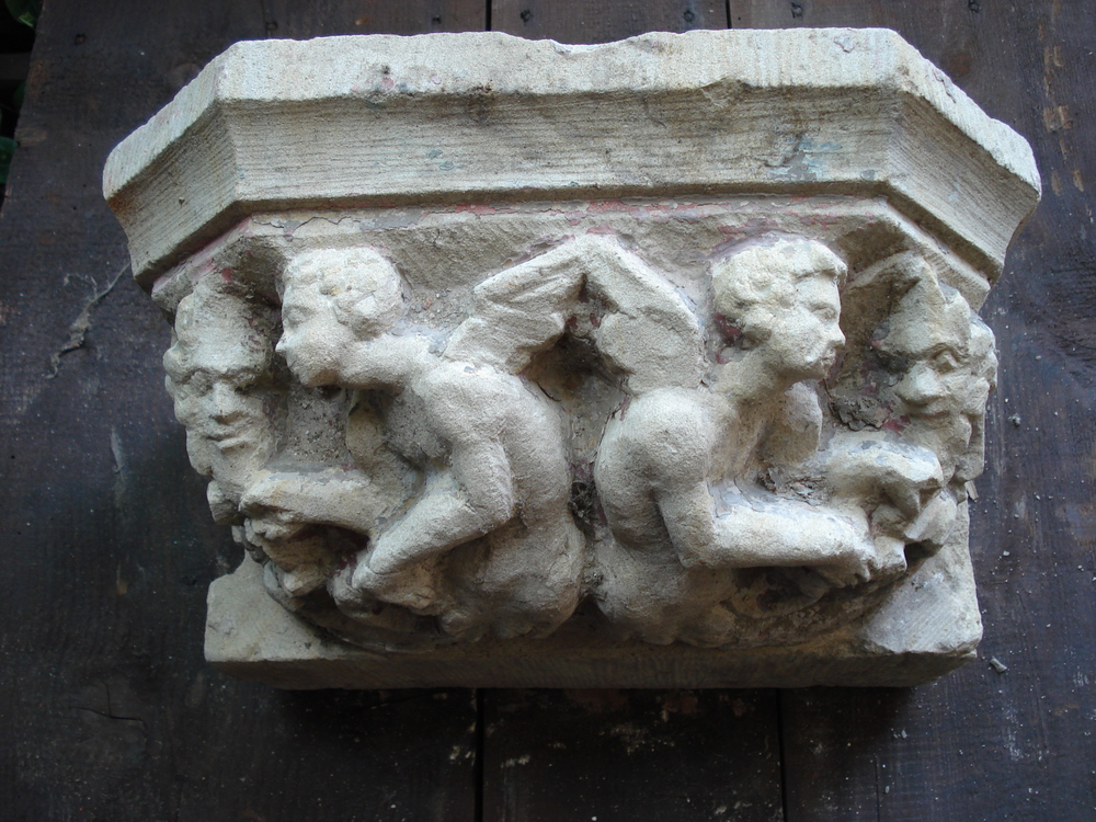 Ledestenen kraagsteen met faunen, gepolychromeerd. U...