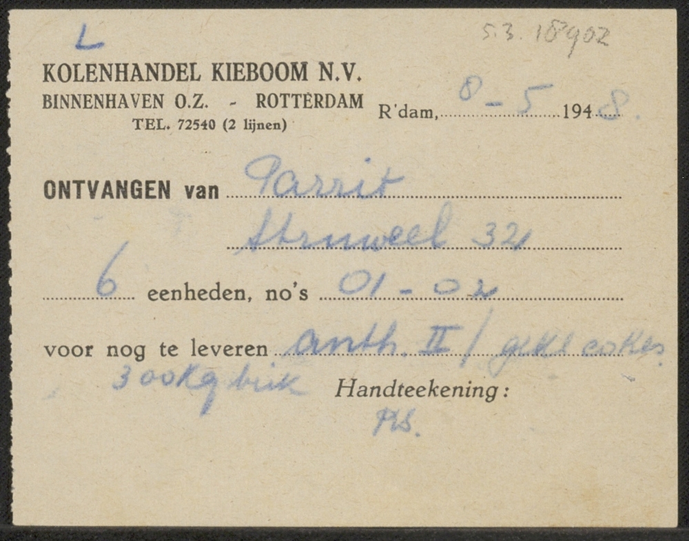 Ontvangstbewijs voor 6 eenheden van kolenhandel Kieb...