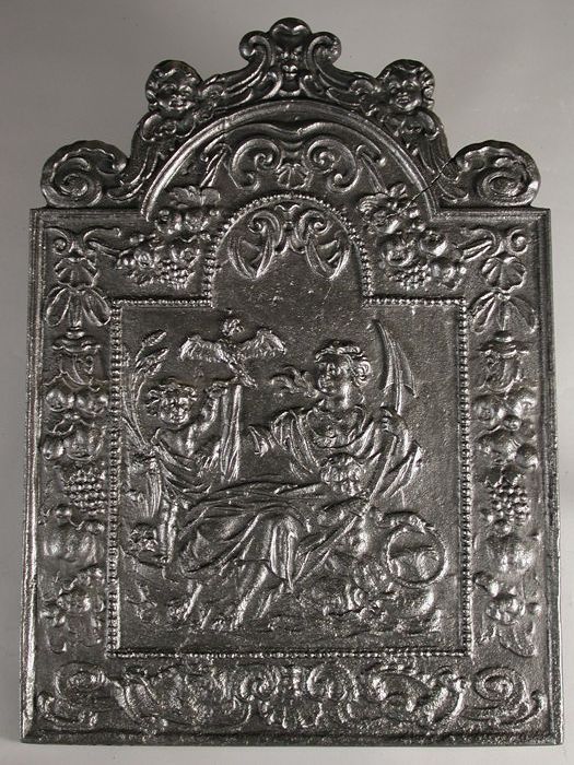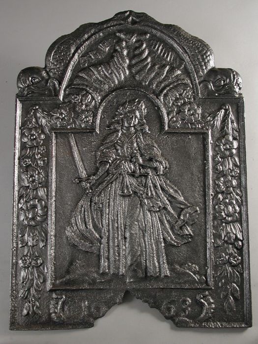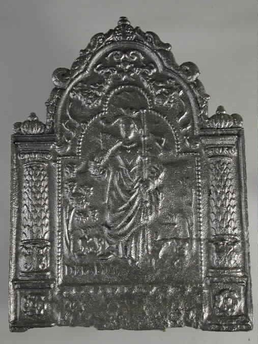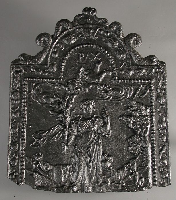 Haardplaat vrouwenfiguur Vrede, jaartal "1679", "PAX"