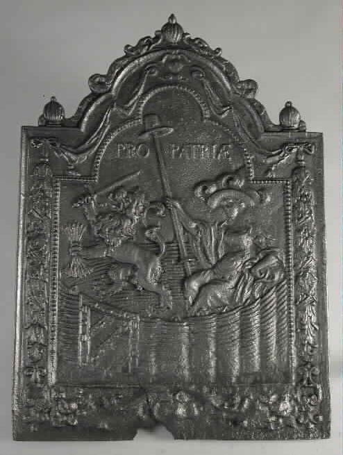 Haardplaat Hollandse maagd in tuin, tekst "Pro Patria"