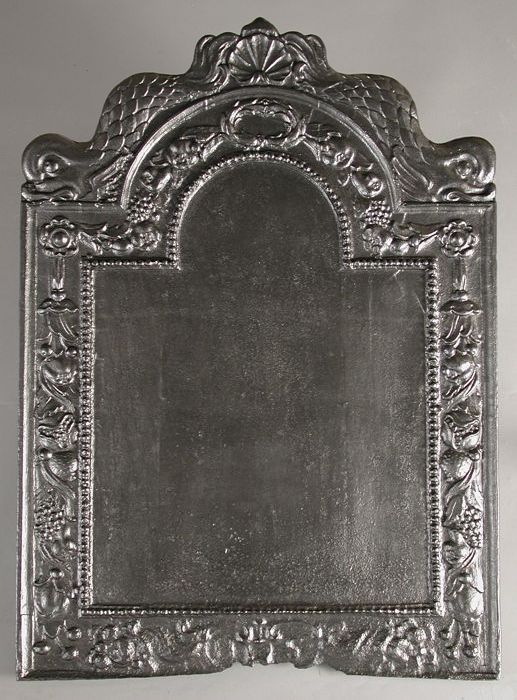 Haardplaat zonder voorstelling, met schelp, dolfijne...
