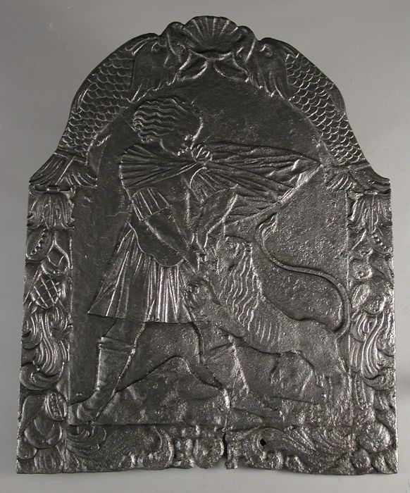 Haardplaat bijbelse voorstelling man met leeuw, Simson