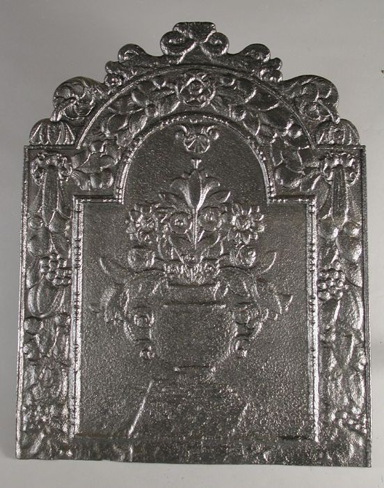 Haardplaat met engelen, lauwerkrans en tulpen