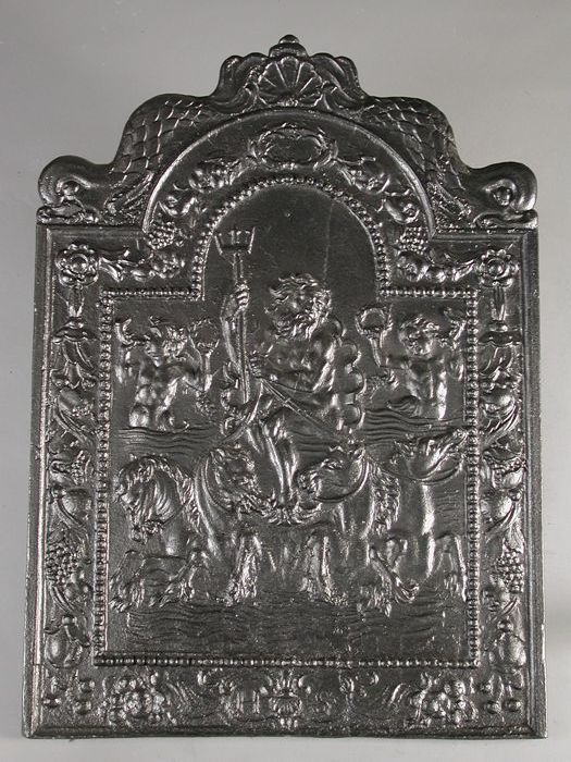 Haardplaat Neptunus op zegekar, tekst "H S"