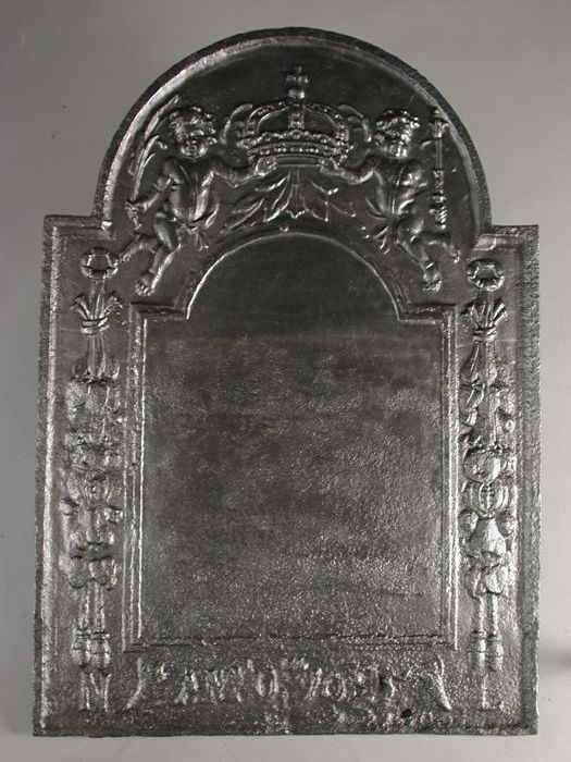 Haardplaat putti met kroon, jaartal "1695" en "N L"