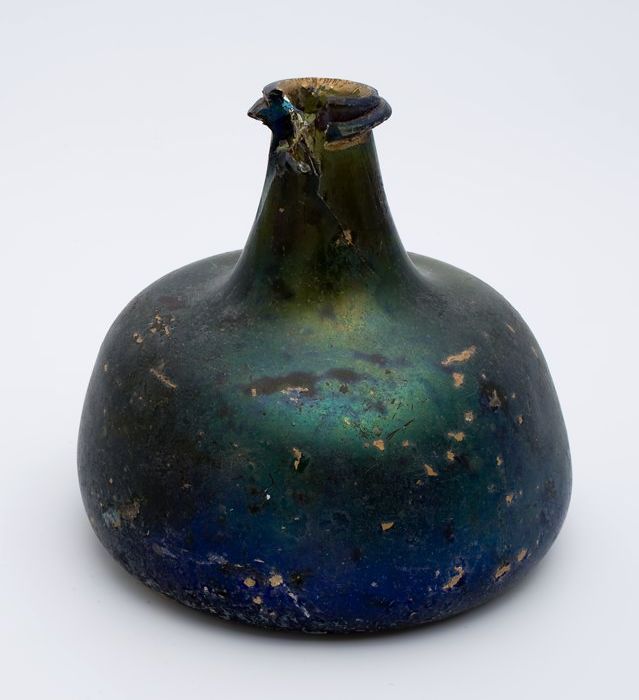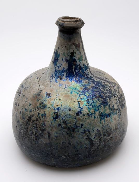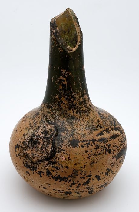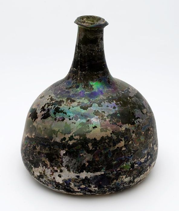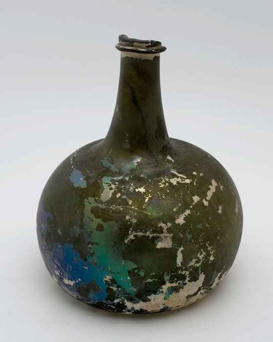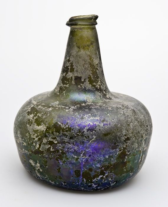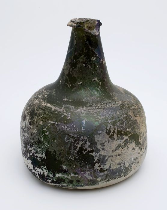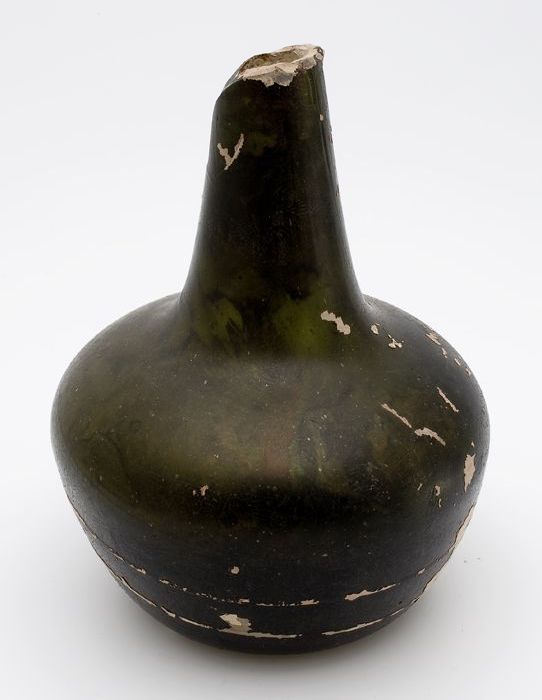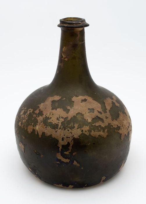 Rondbuikige fles in olijfgroen glas, aangetast en ge...
