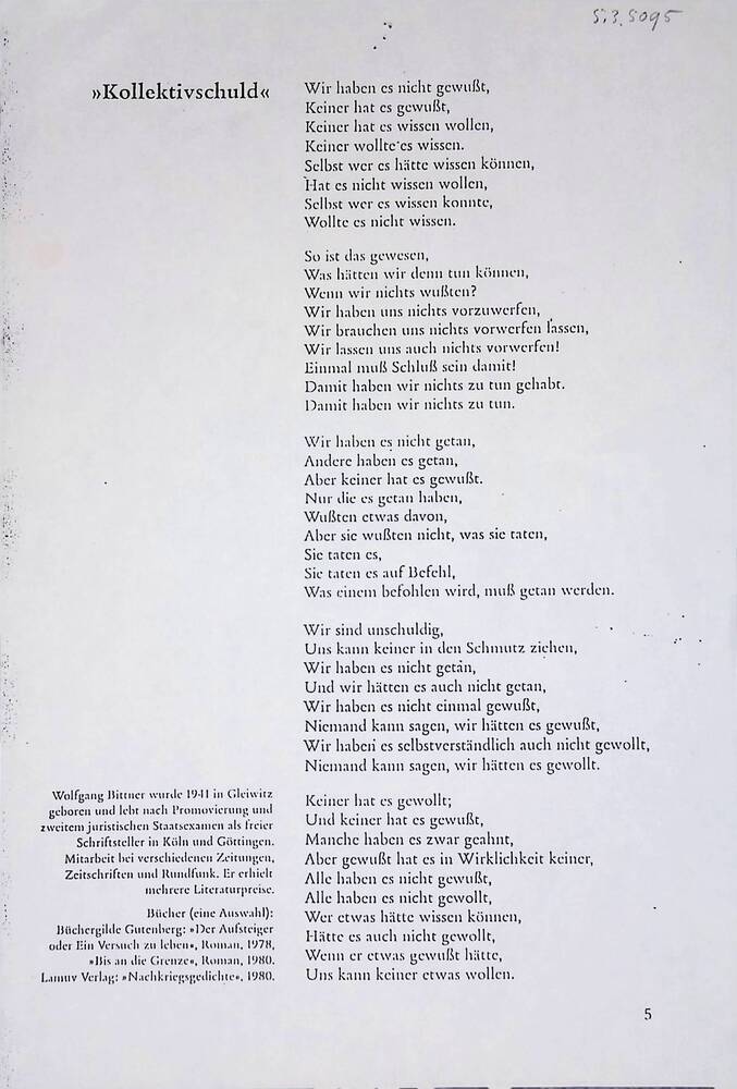 Vel met tekst gedicht "Kollektivschuld"