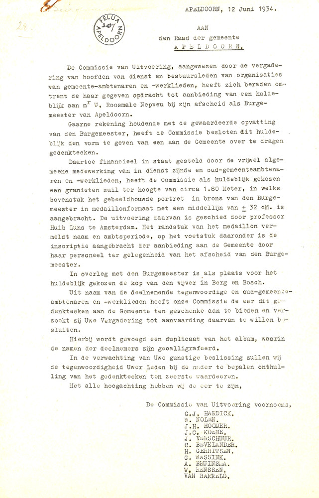 Brief met betrekking tot het huldeblijk aangeboden d...