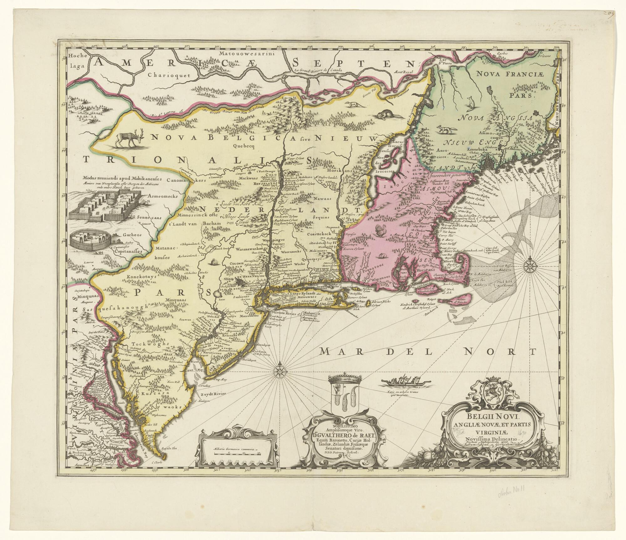 Met de hand gekleurde kaart van Nieuw Nederland, Nie...