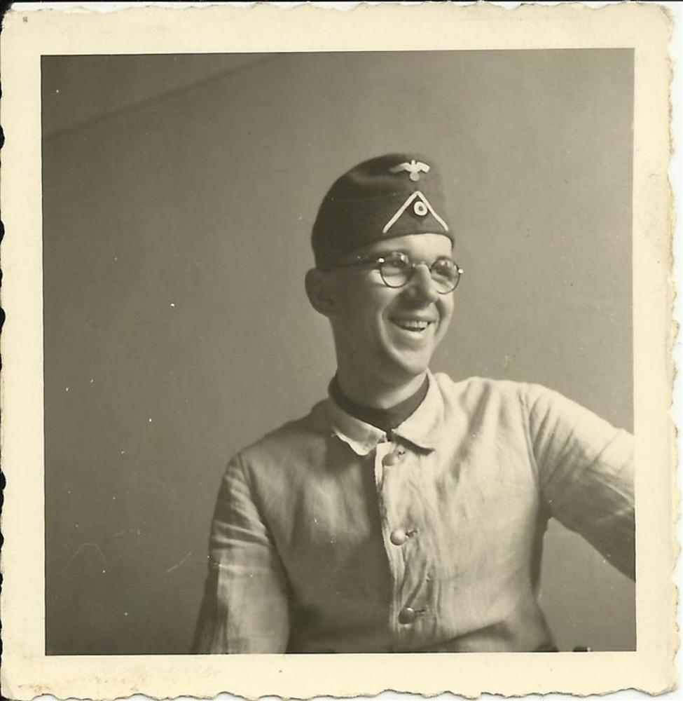 Portret lachende Duitse soldaat, jong met bril