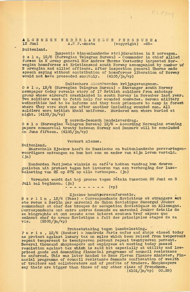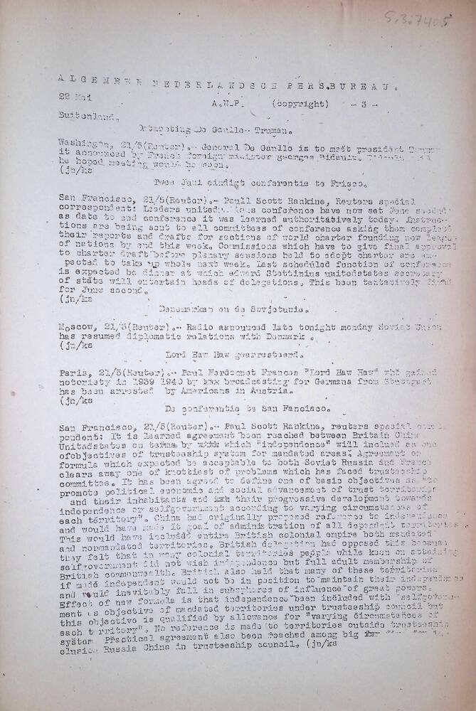 Algemeen Nederlandsch Persbureau, mededelingen, 22 m...