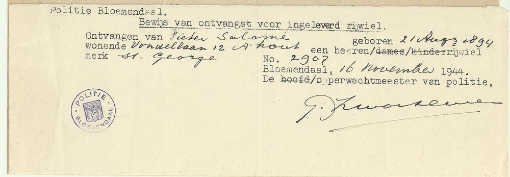 Politie Bloemendaal, bewijs van ontvangst voor ingel...
