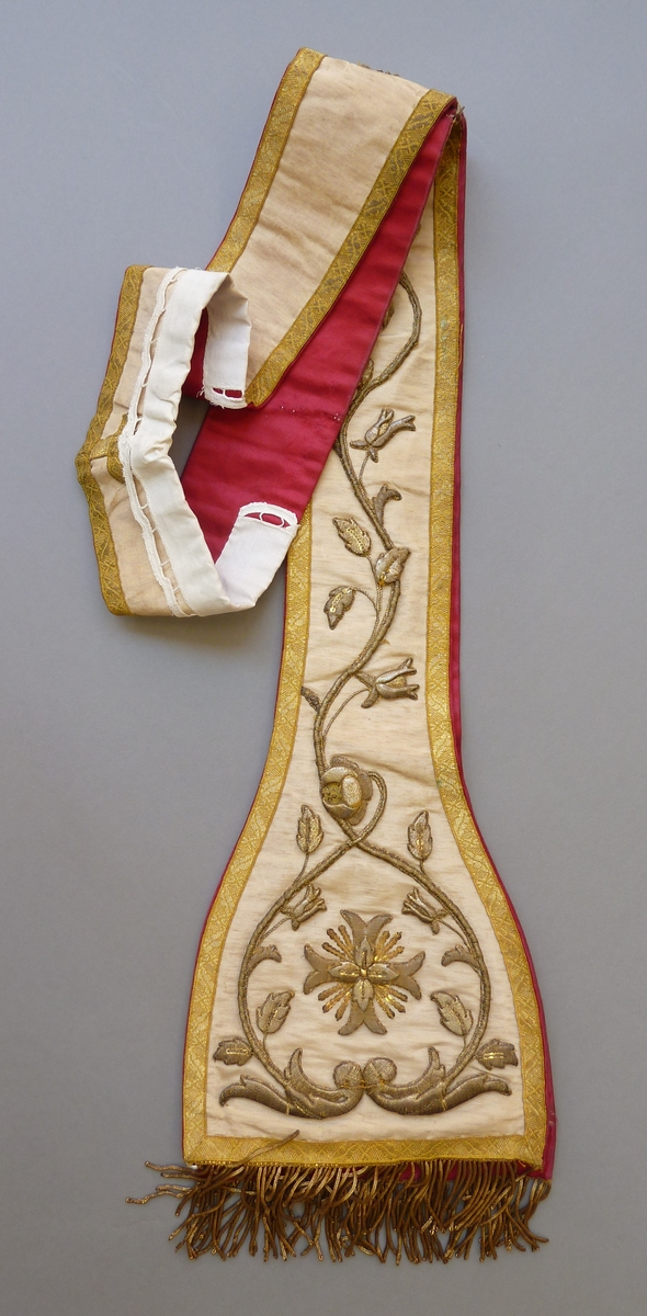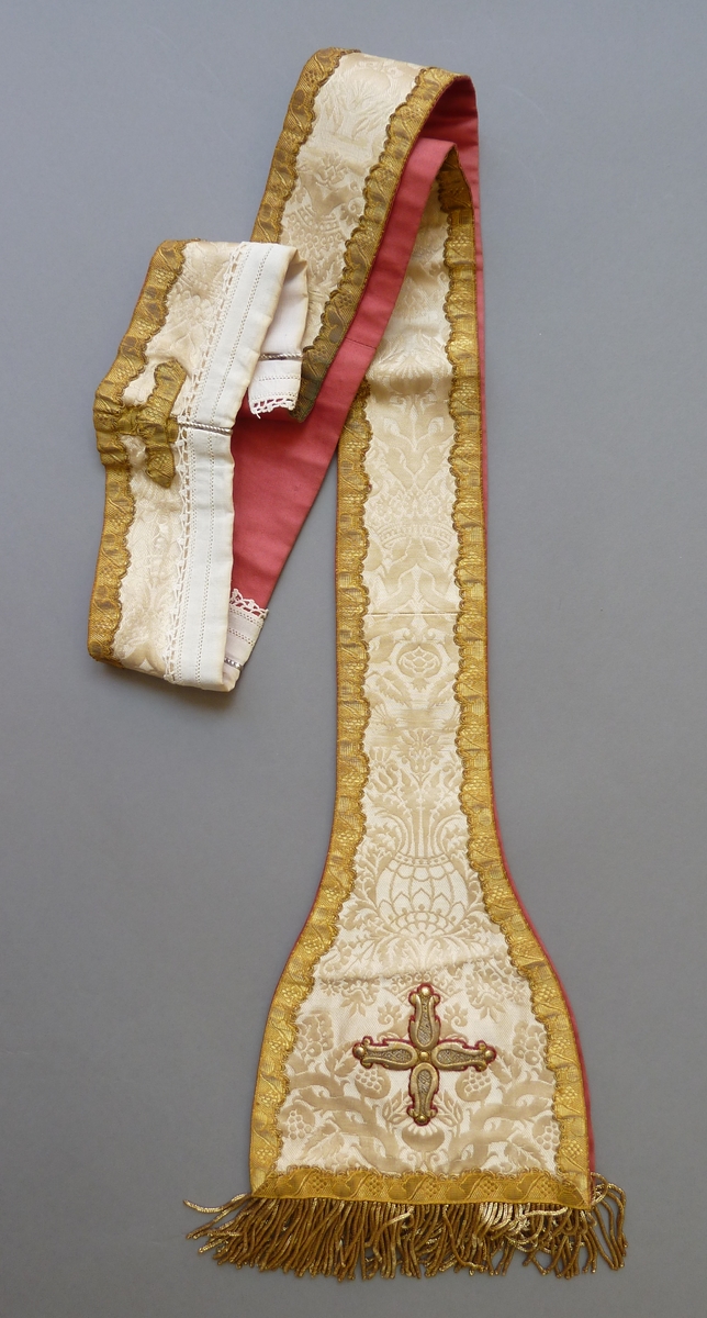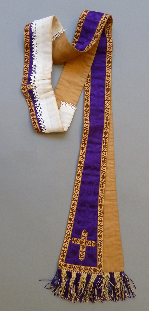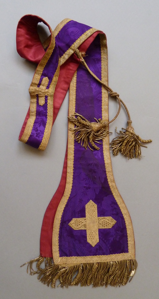 Paarse manipel afgezet met geel-rood galon en idem k...