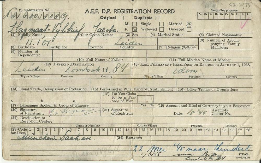 A.E.F. D.P. Registration Card op naam van J. Slagmaa...