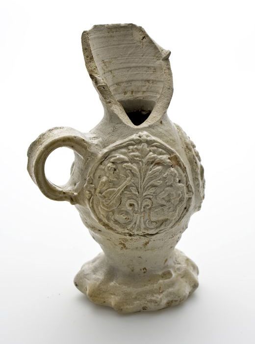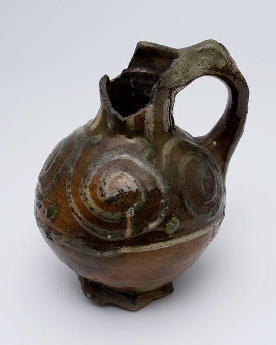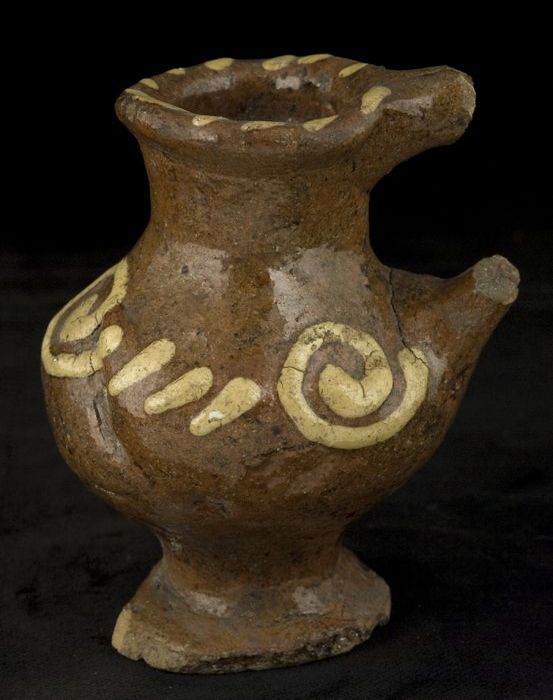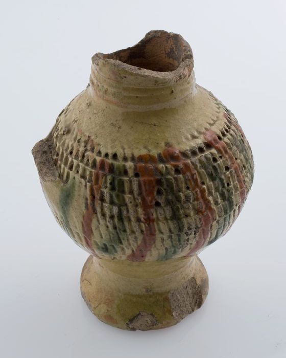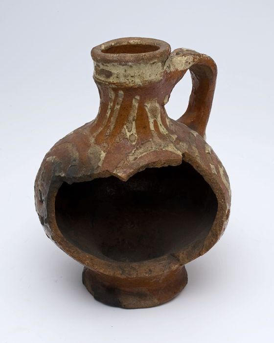 Fragment aardewerk oliekan, op standring met staand ...