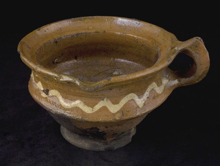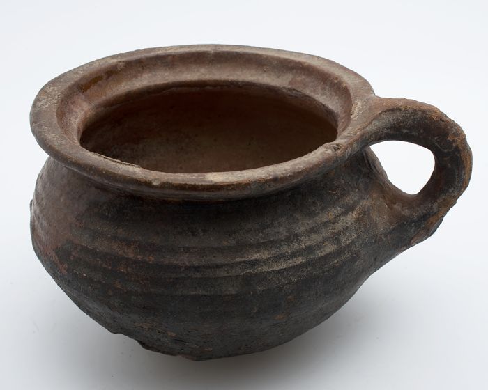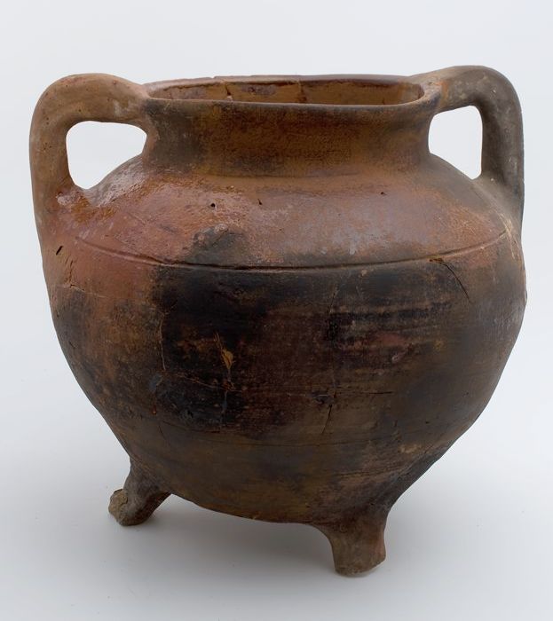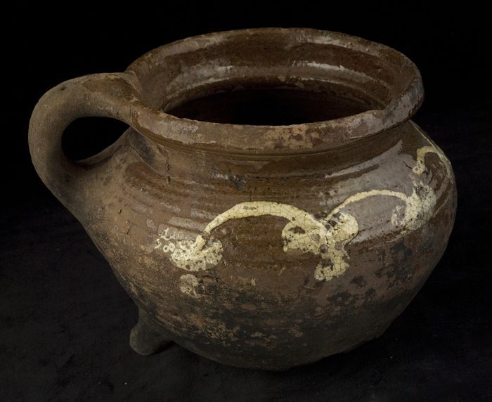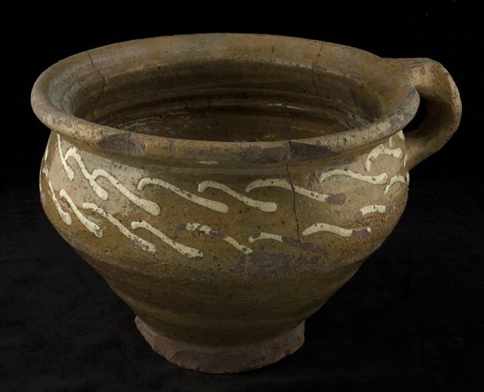 Aardewerk kookpot, grape, versierd in slibtechniek, ...