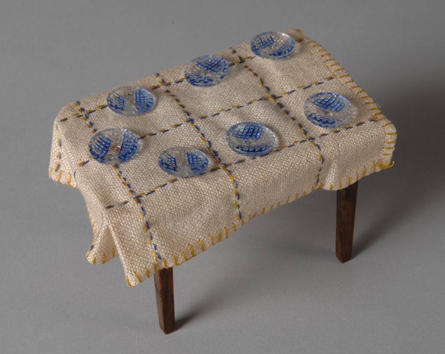 Zeven glazen knopen in poppenhuis gebruikt als bordj...