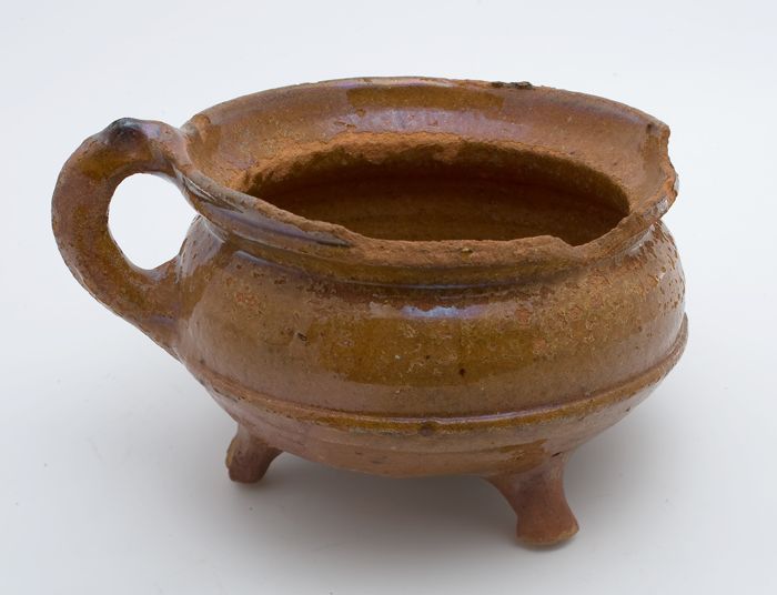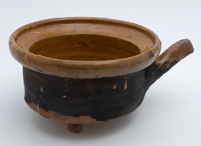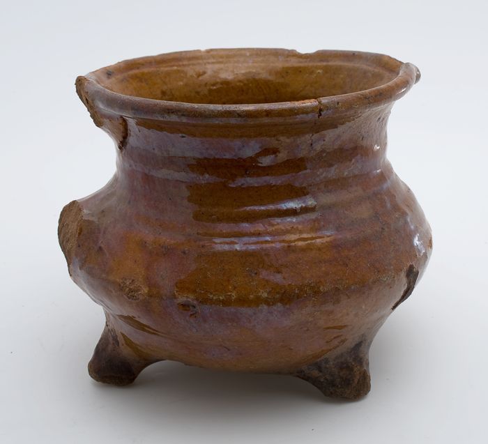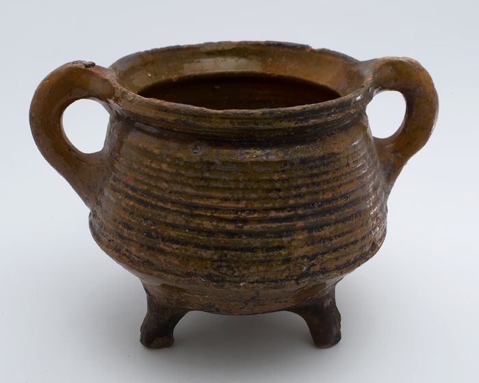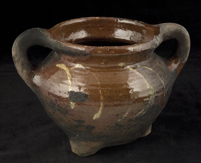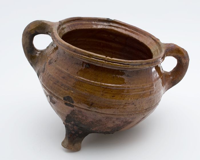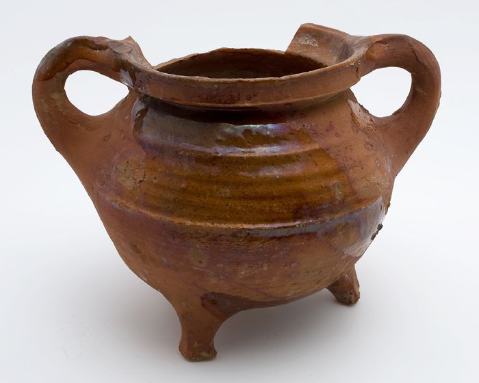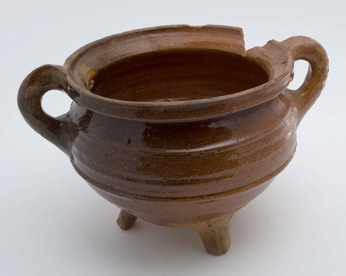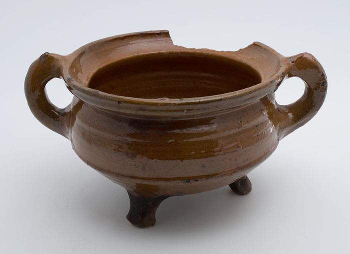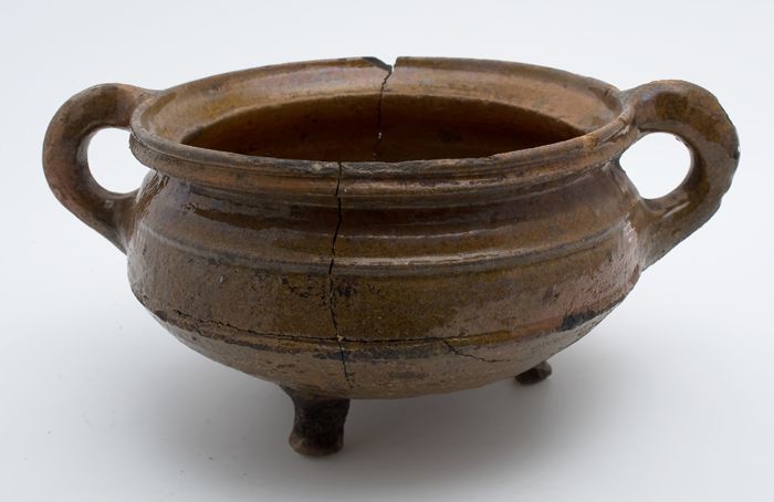 Aardewerk kookpot, rode scherf met loodglazuur, twee...