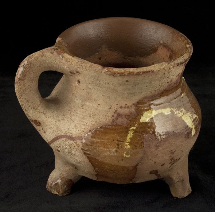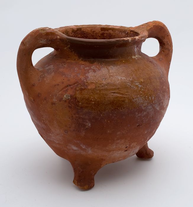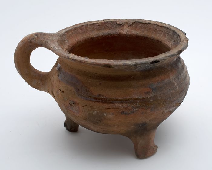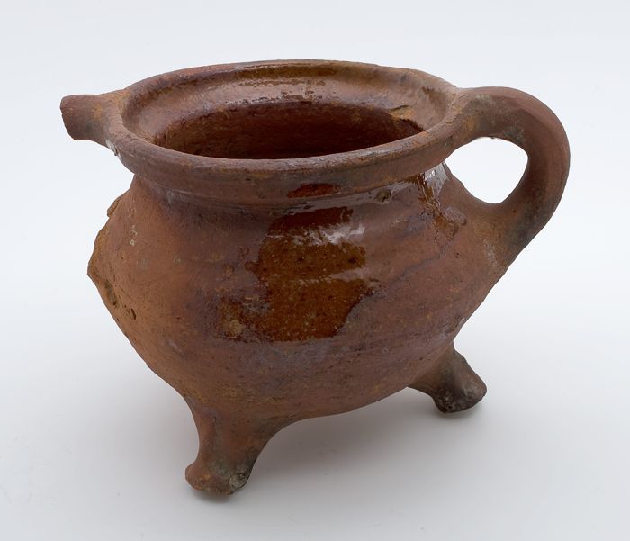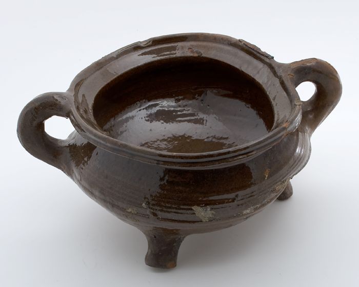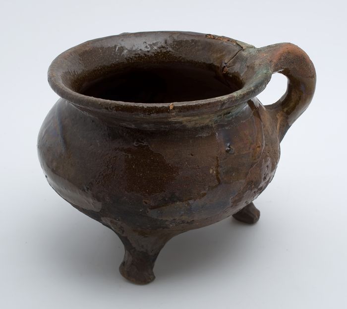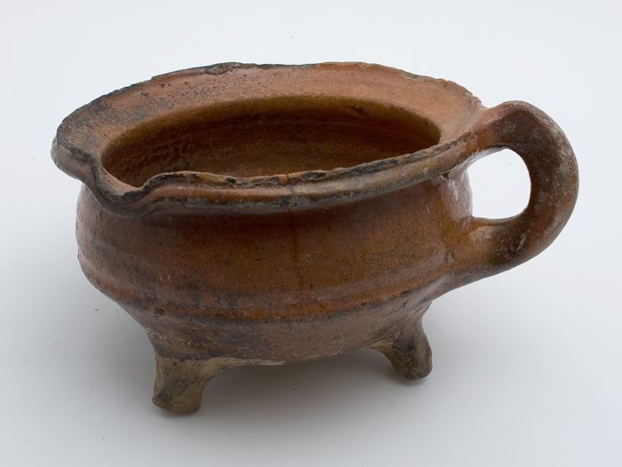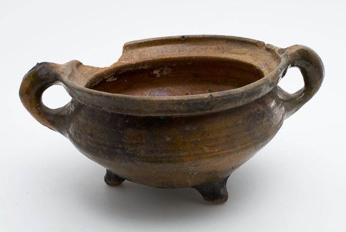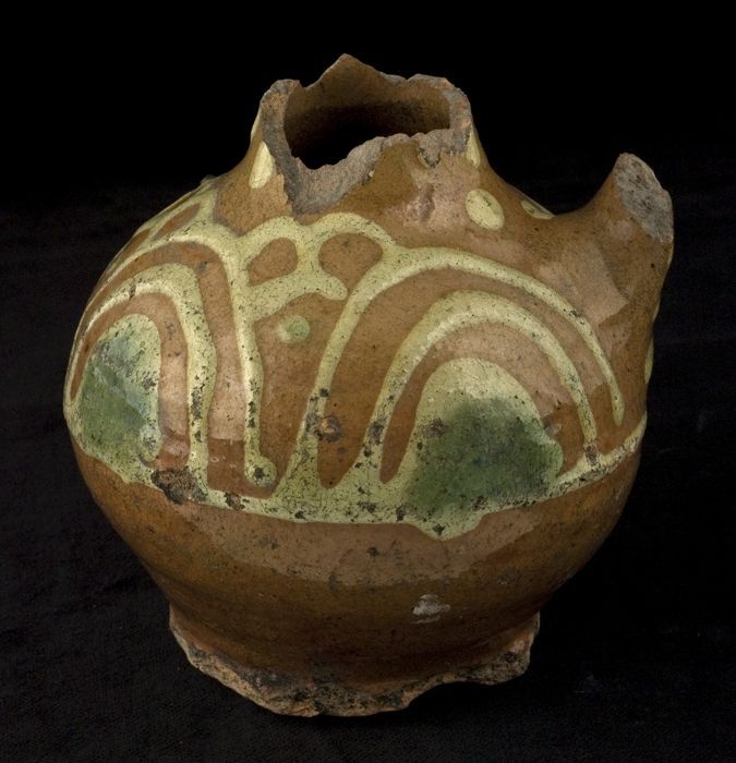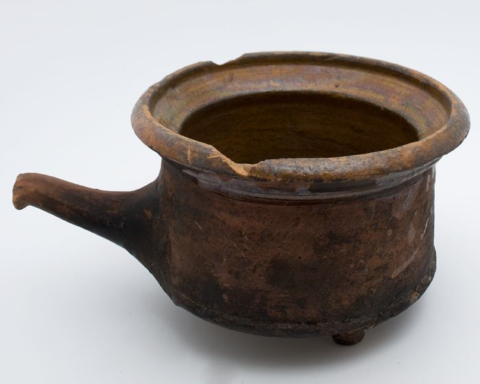 Aardewerk kookpot, rode scherf met loodglazuur, twee...