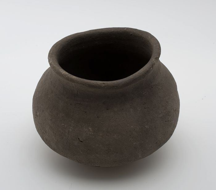 Aardewerk kogelpot, grijze scherf, naar buiten geric...