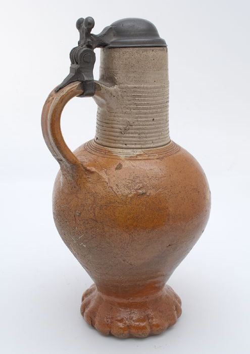 Steengoed kruik met handvat, tinnen montuur en dekse...