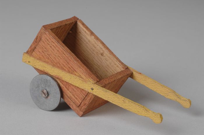 Roodbruine kruiwagen op twee wieltjes gemaakt van mu...