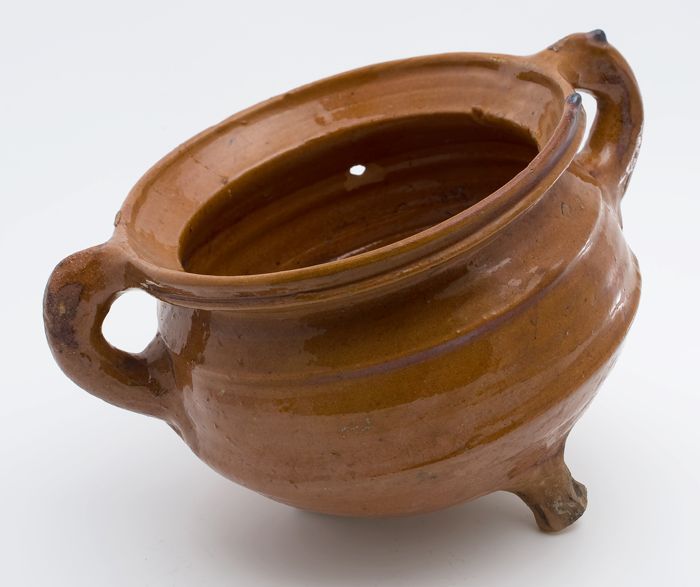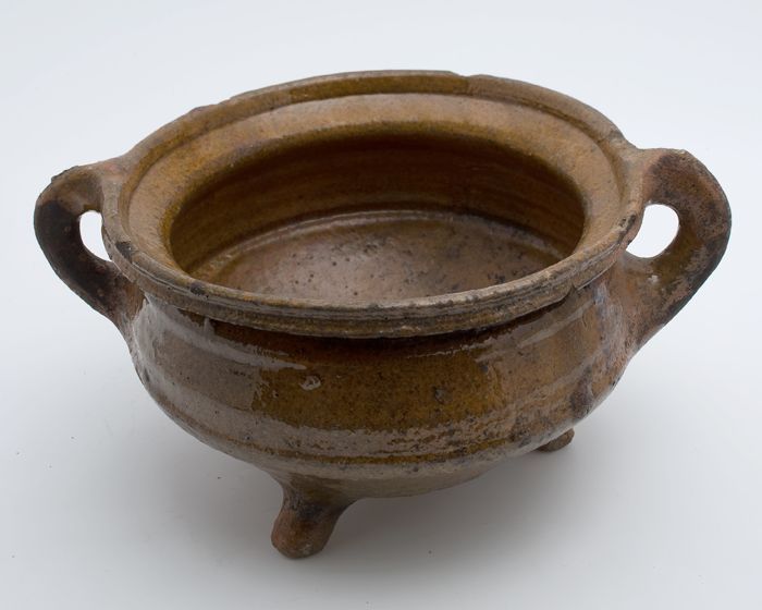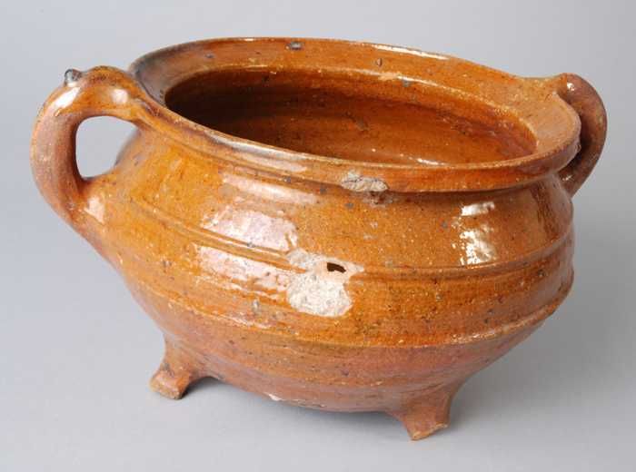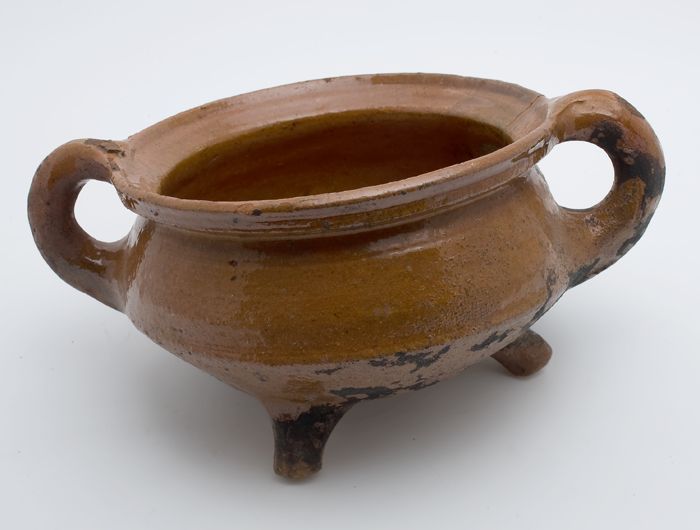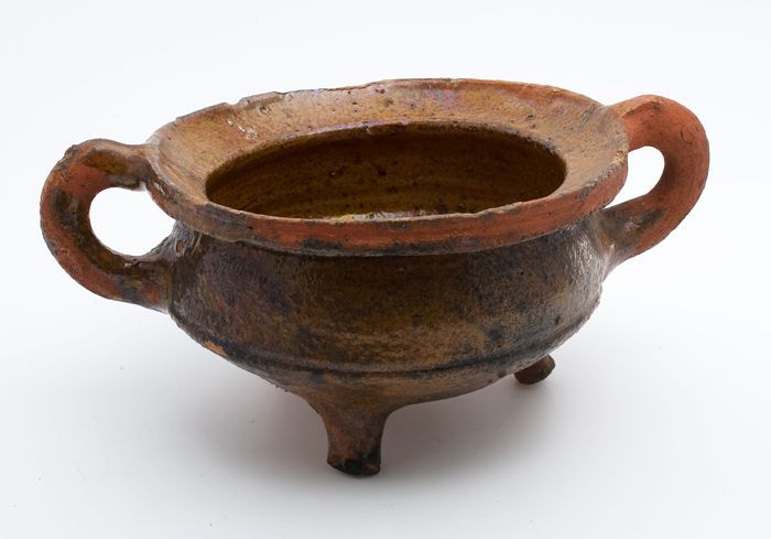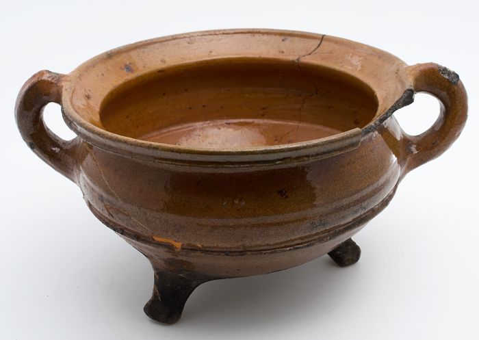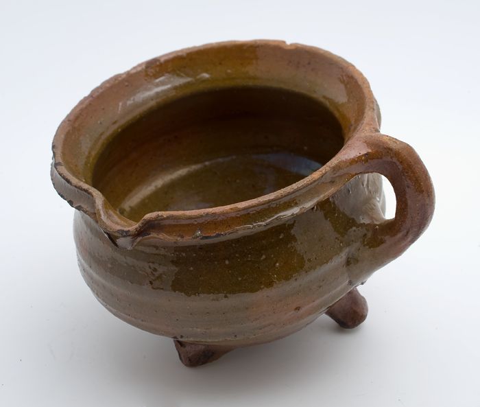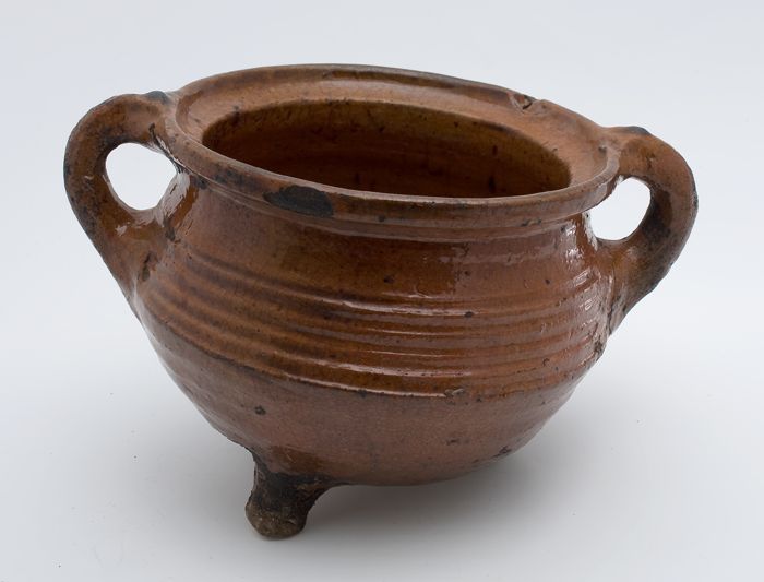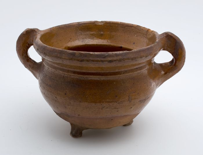 Aardewerk kookpot, rode scherf, geglazuurd in geel e...