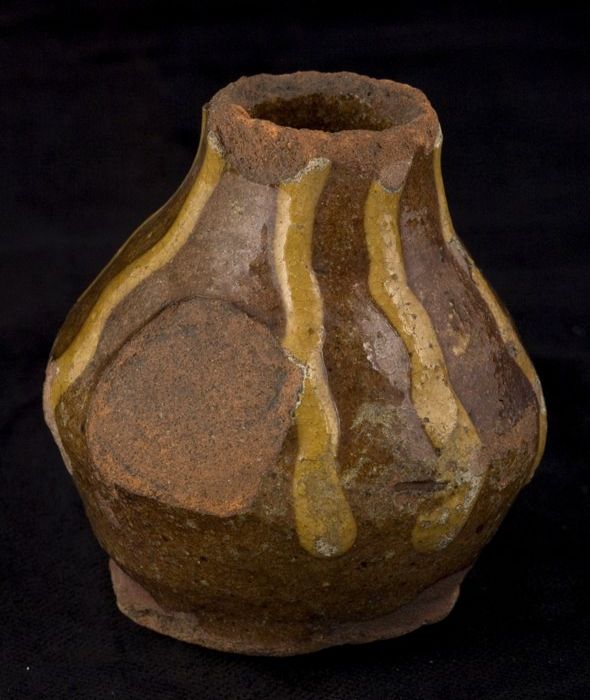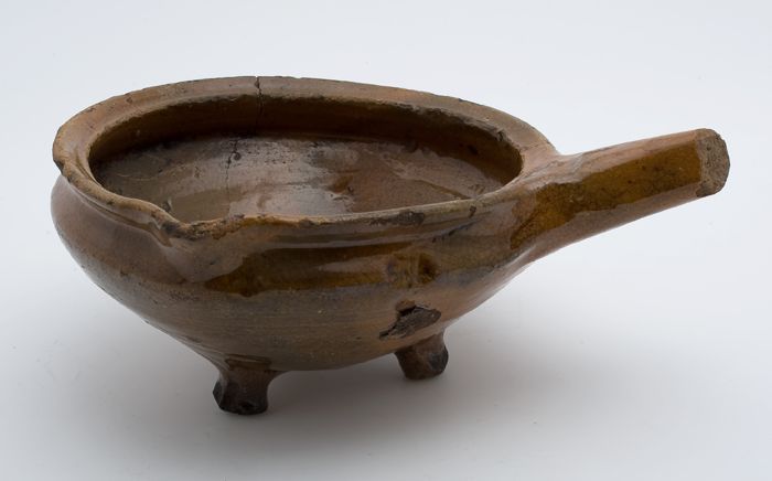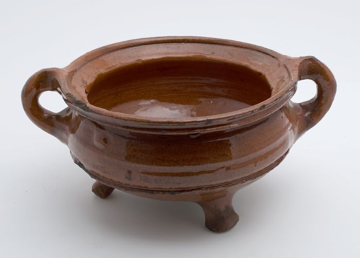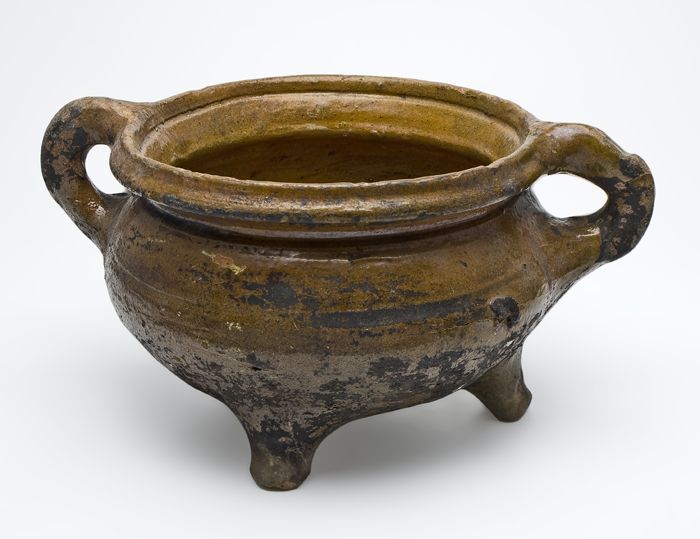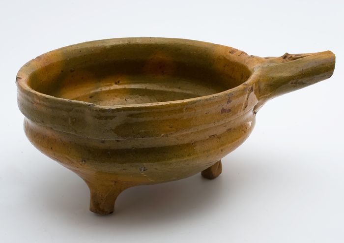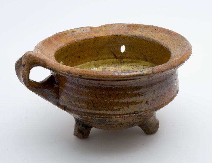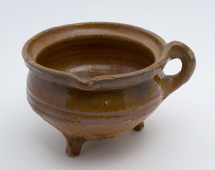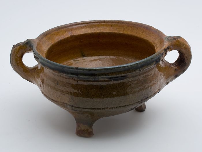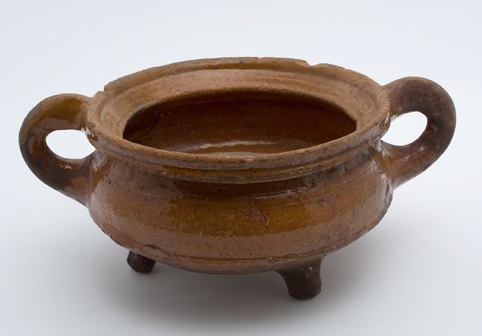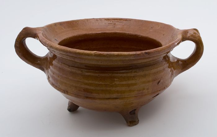 Aardewerk kookpot, rode scherf, geglazuurd in geel e...