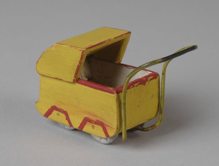 Gele poppenwagen op vier wielen gemaakt van muntjes ...