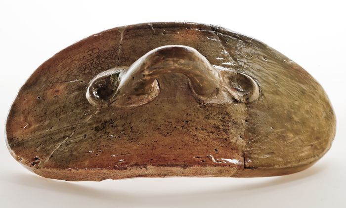 Aardewerk buikwarmer, ovaal en gebogen object met li...