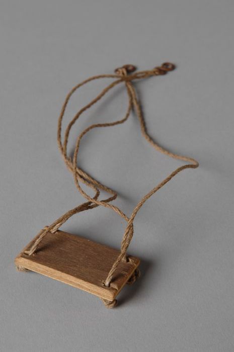 Miniatuur schommel, houten plankje aan vier touwen m...