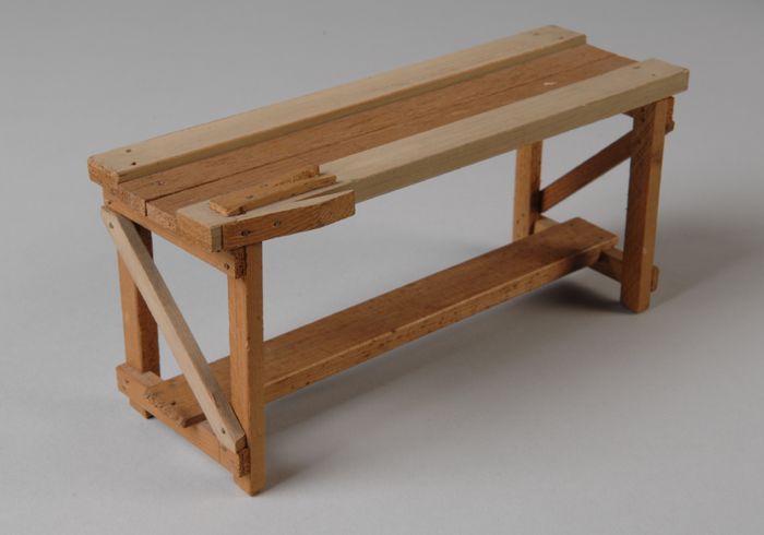 Houten miniatuur werkbank met klem