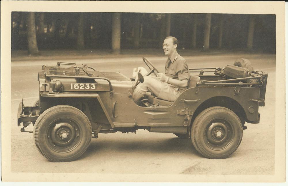 Prins Berhard achter het stuur van een Jeepjuni 1946