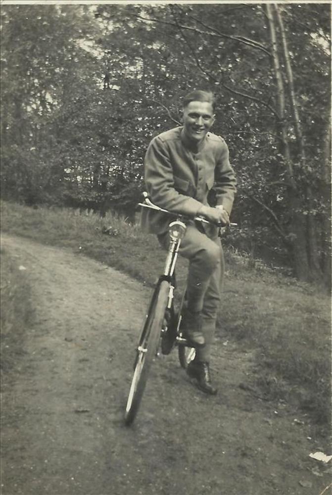 nederlandse militair blootshoofds met fiets op bospad