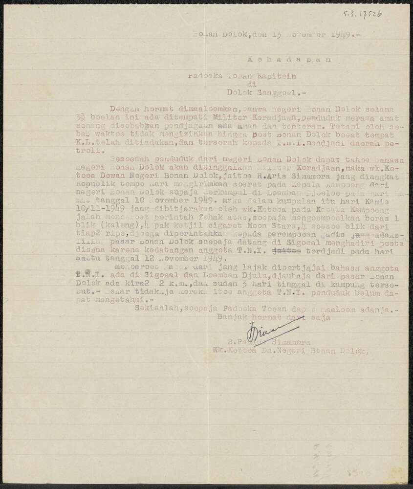 Brief in het maleis van R. Paulus Simamora aan de ka...