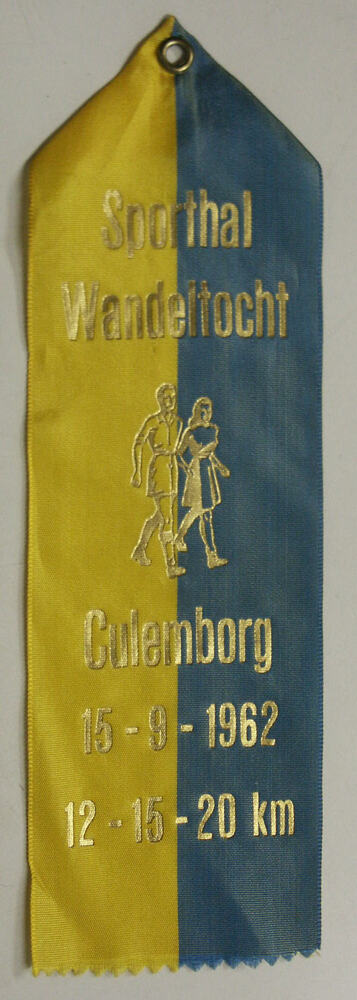 Medaille van zilverkleurig metaal aan rood/geel draa...