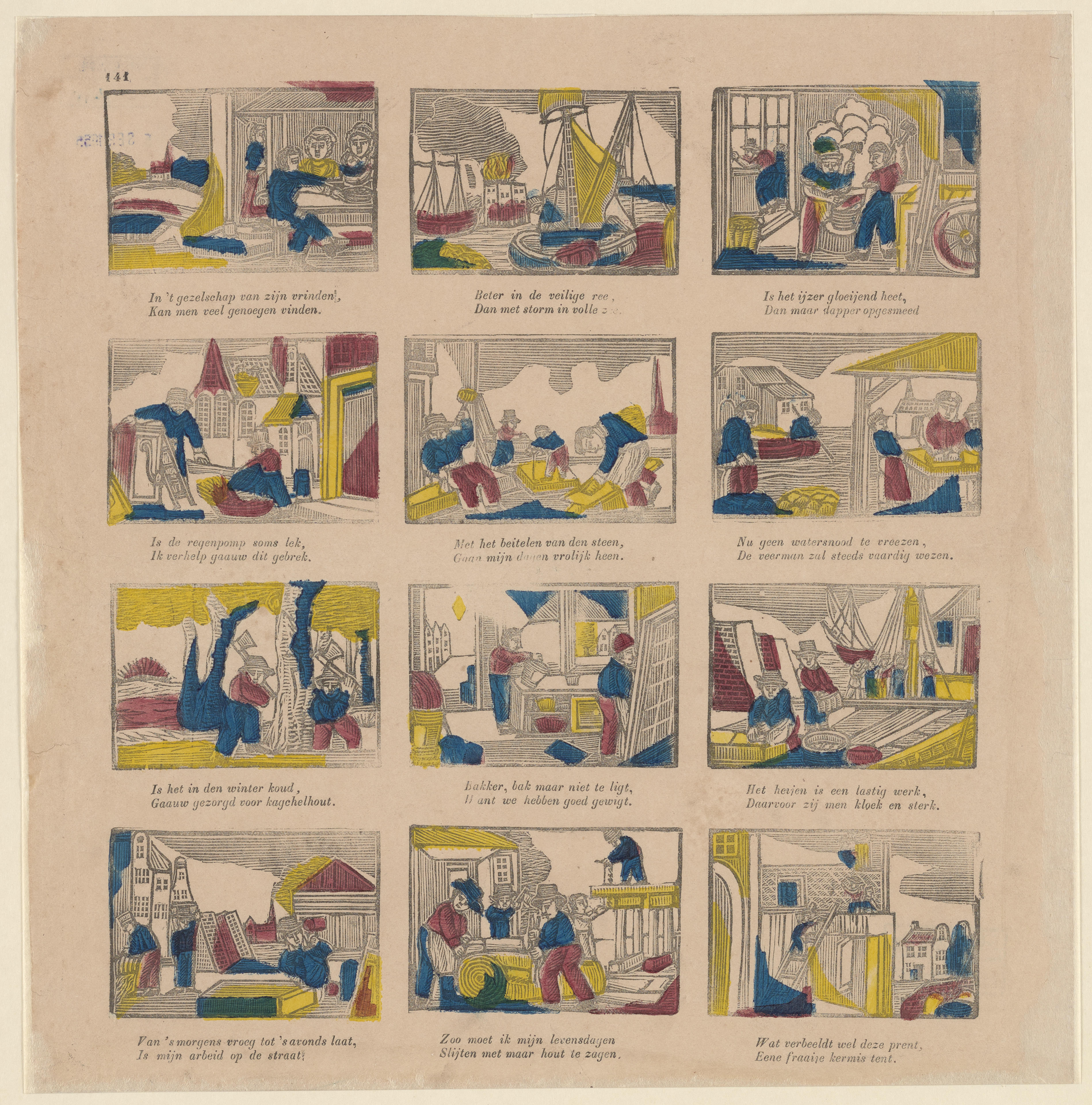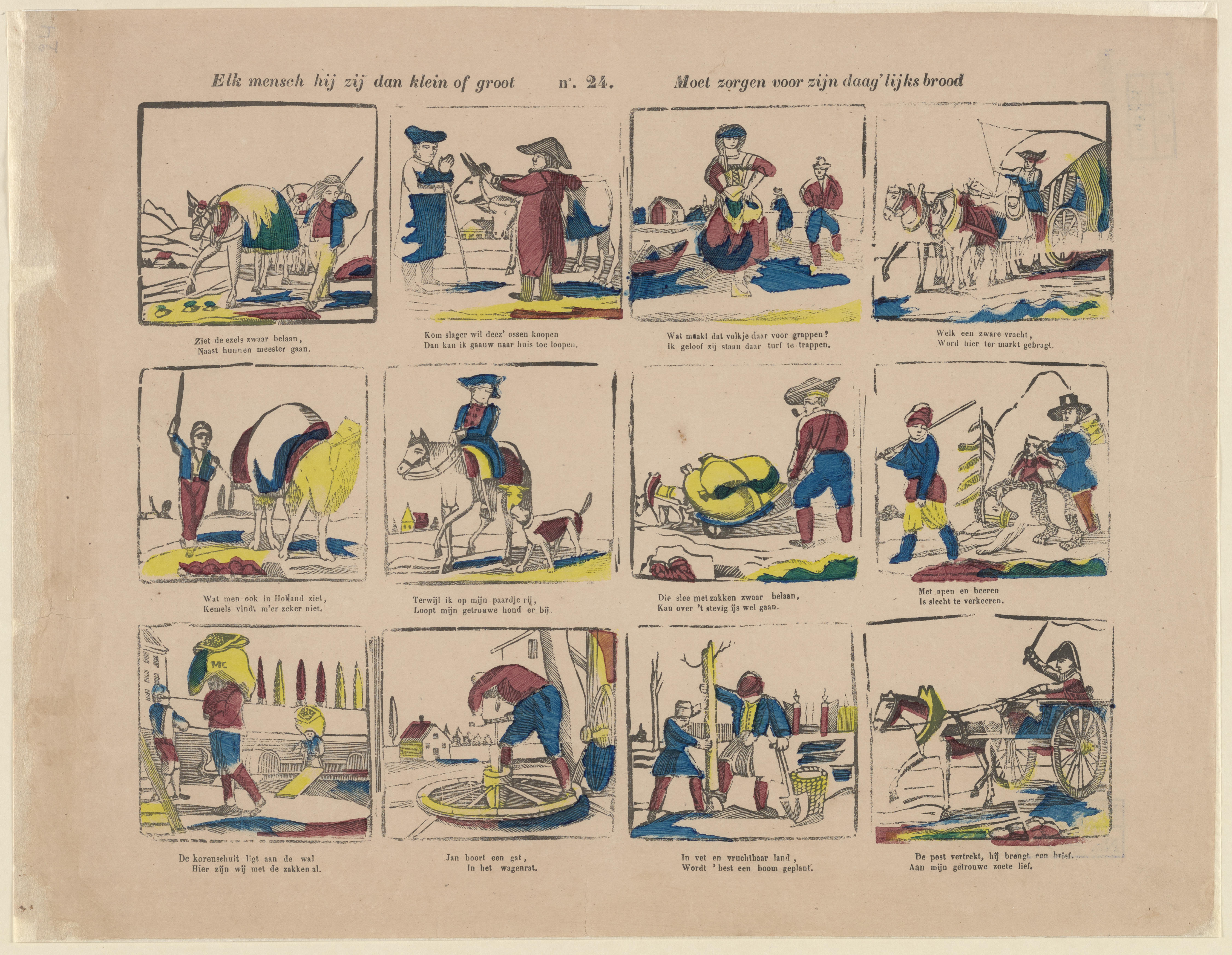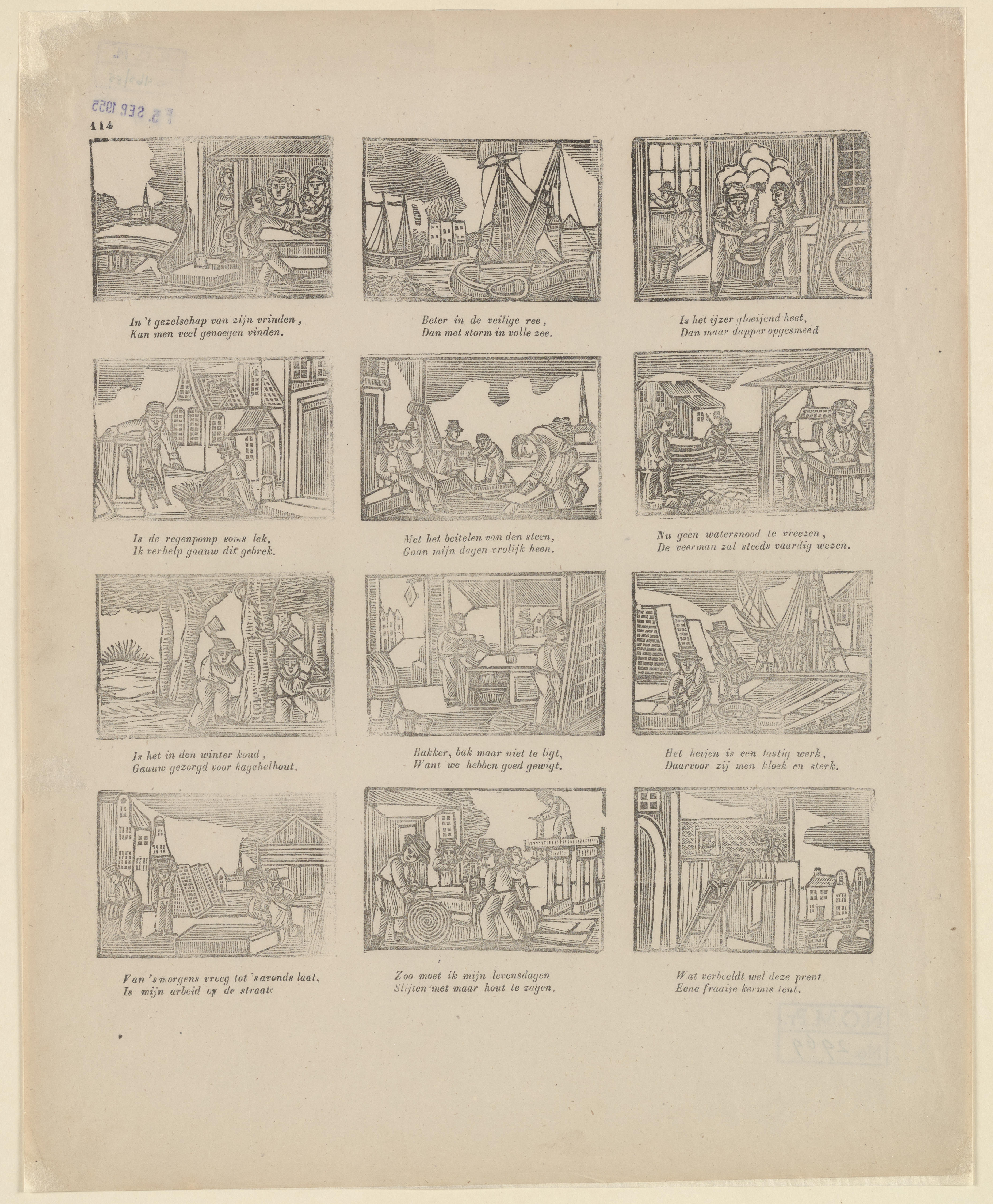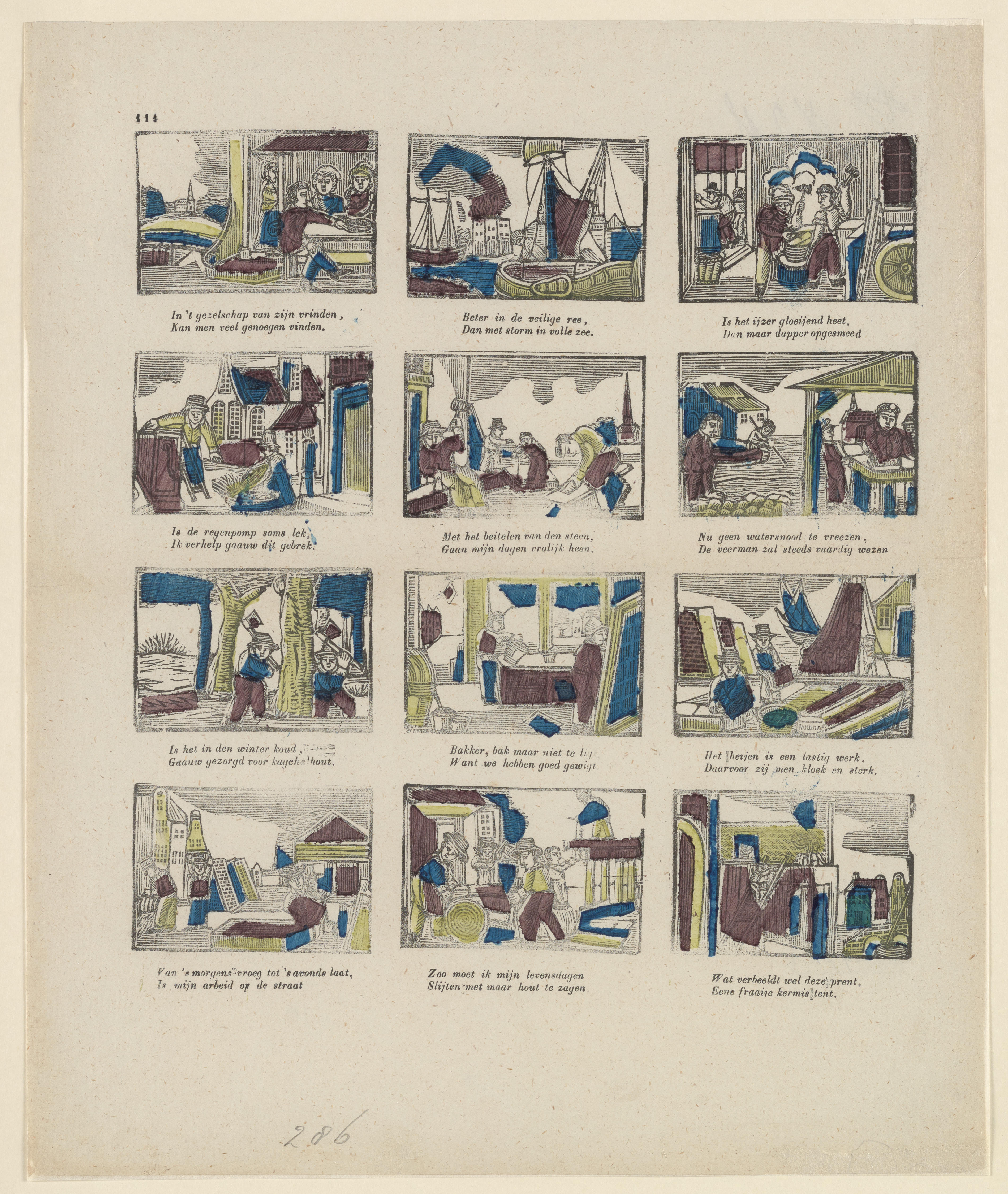 Onderwijsprent met allerlei bezigheden. - V.