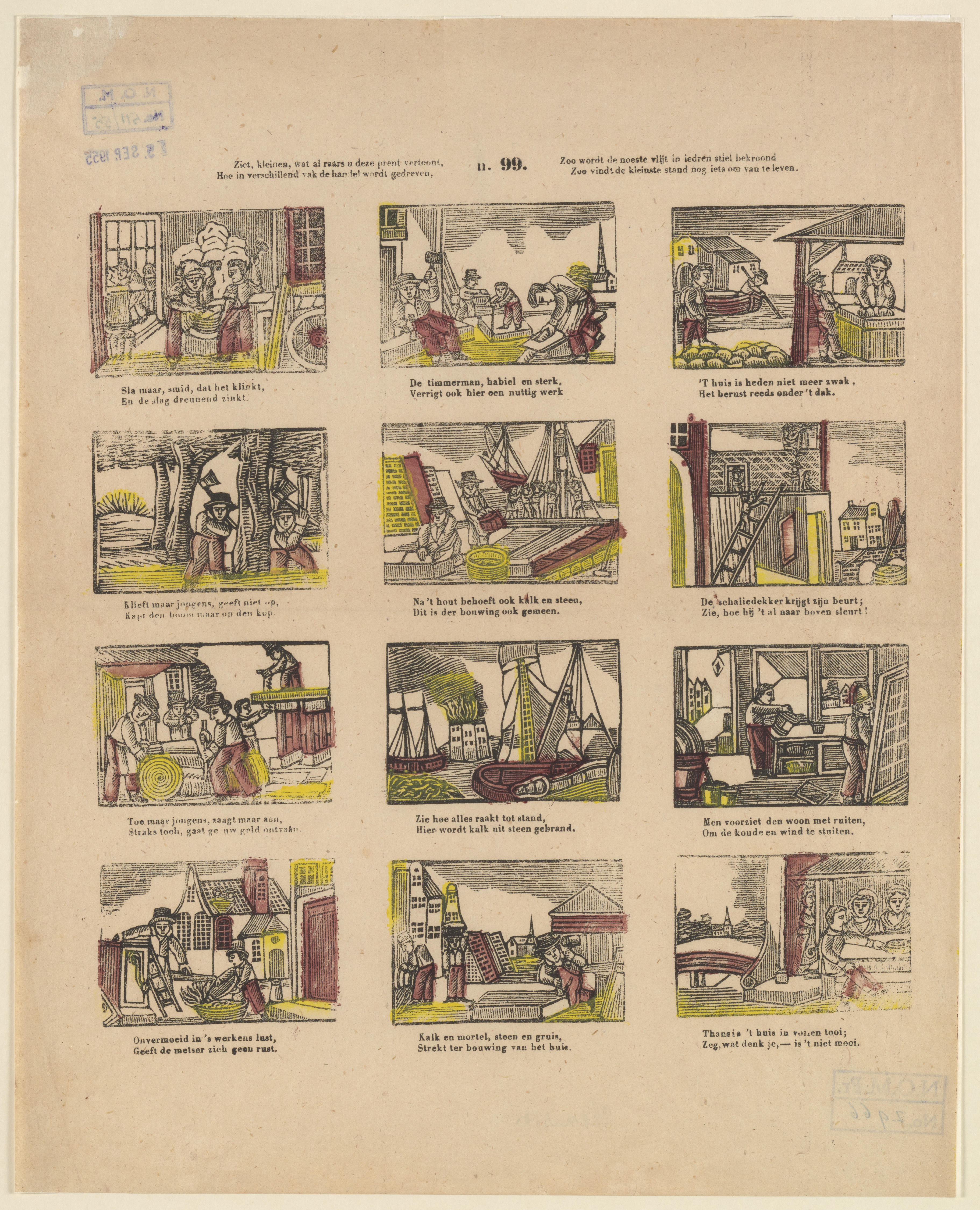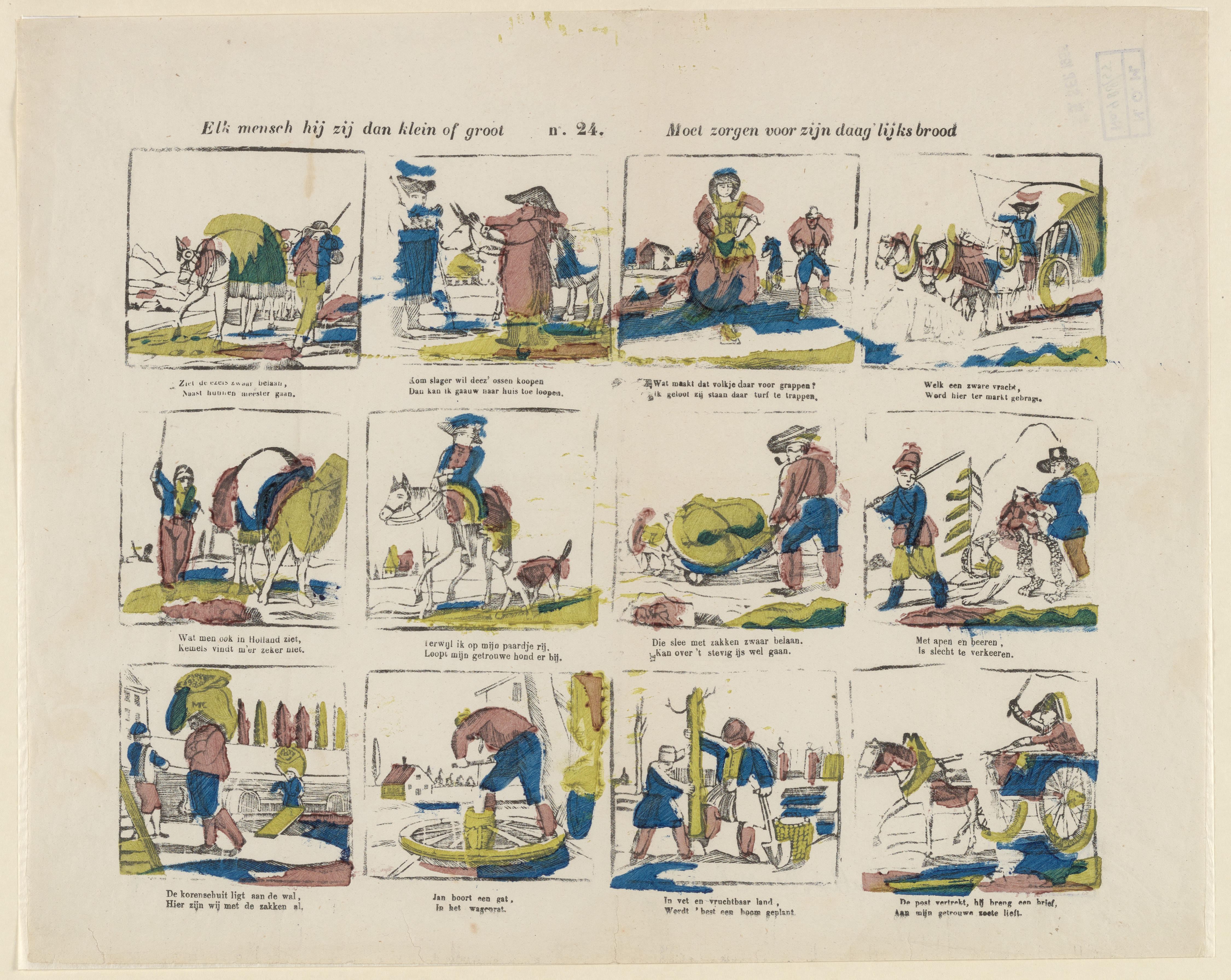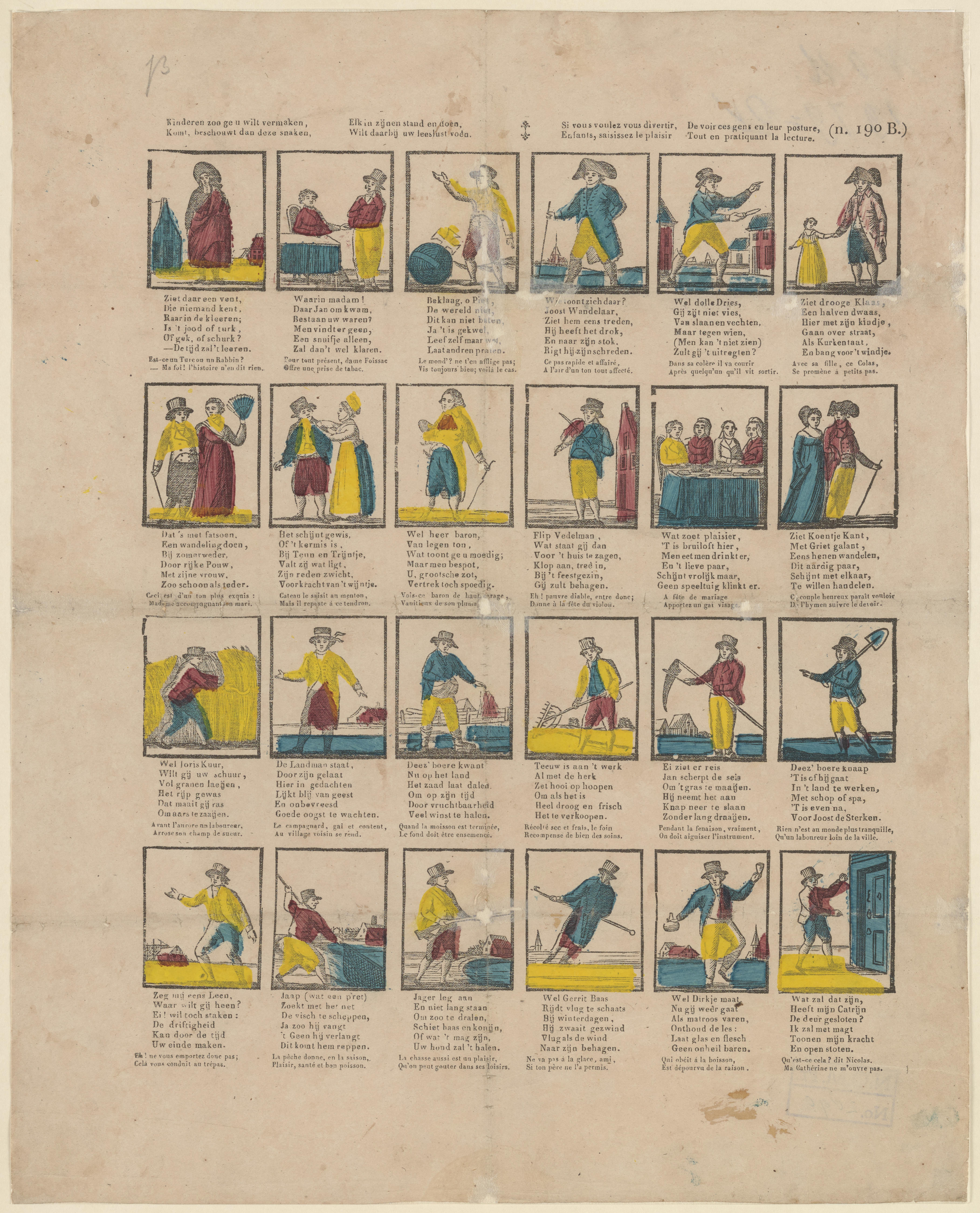 Onderwijsprent met allerlei bezigheden. - V.