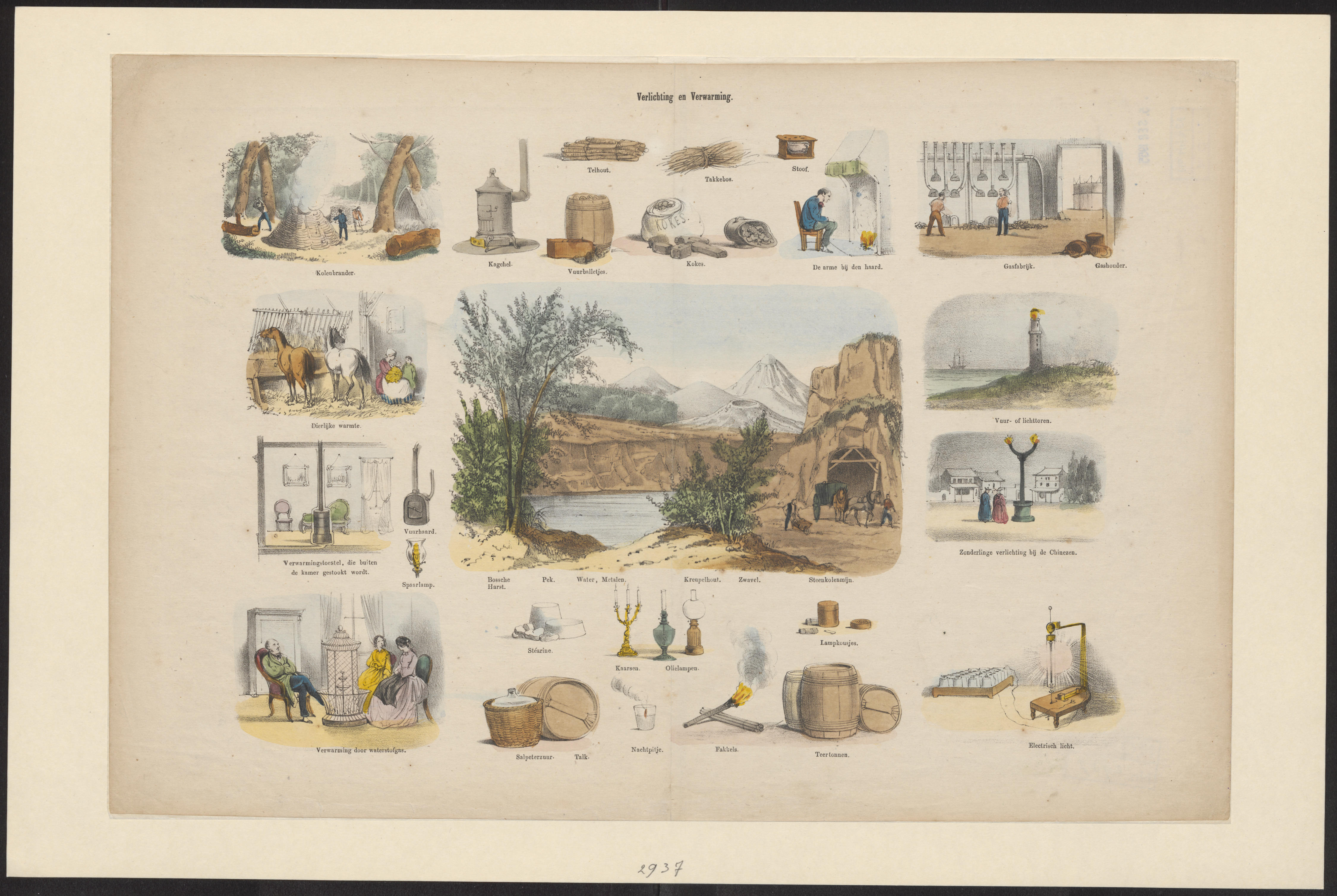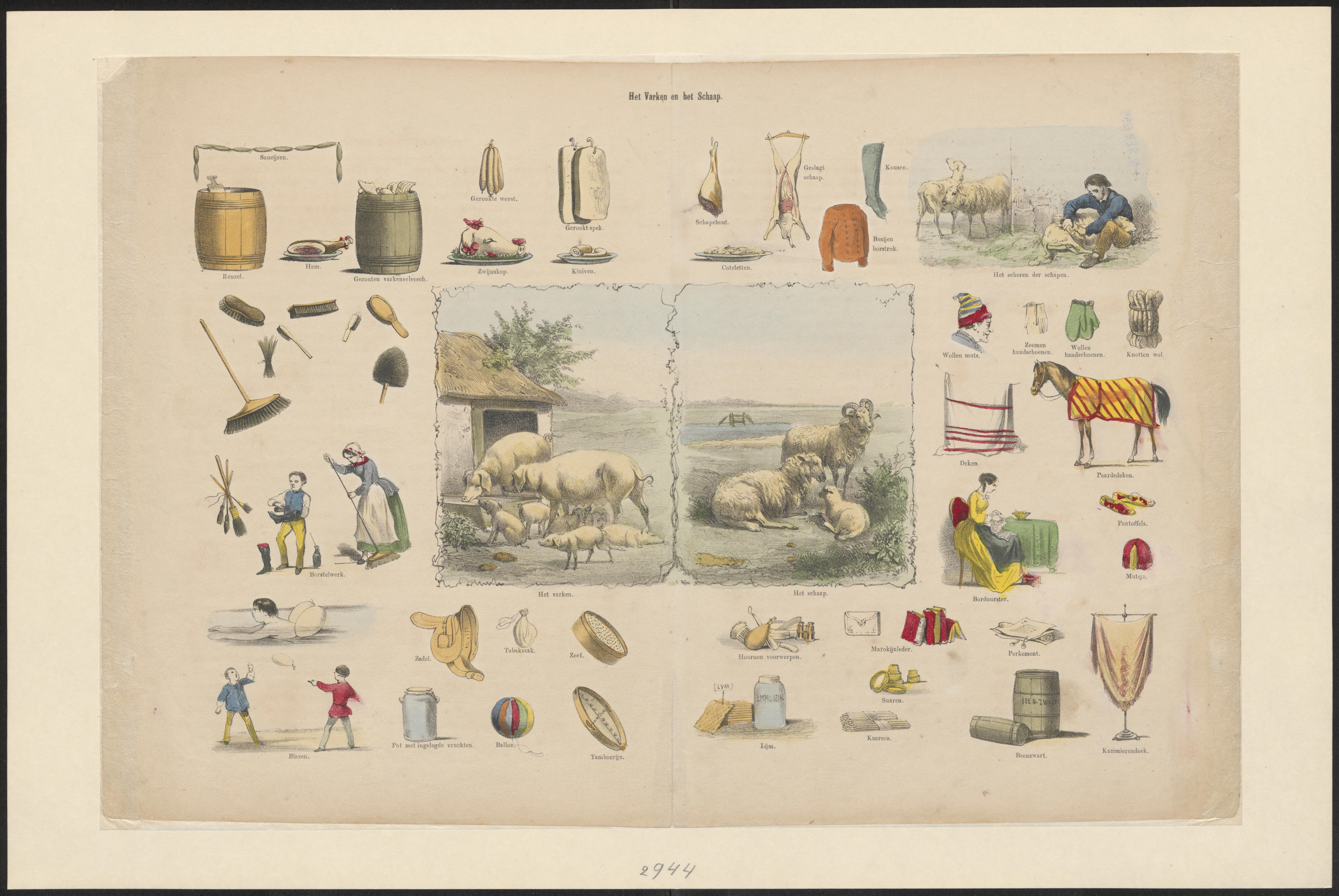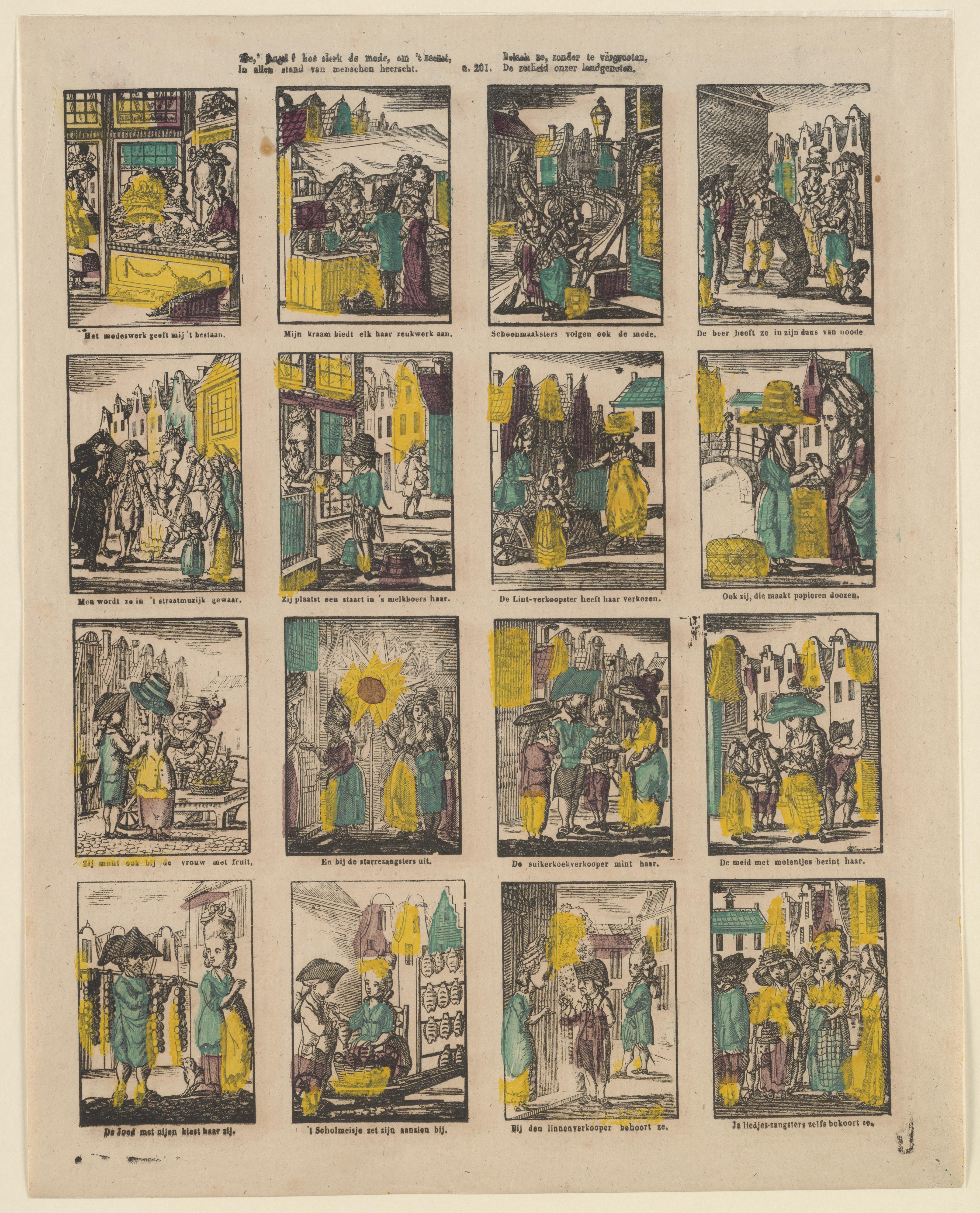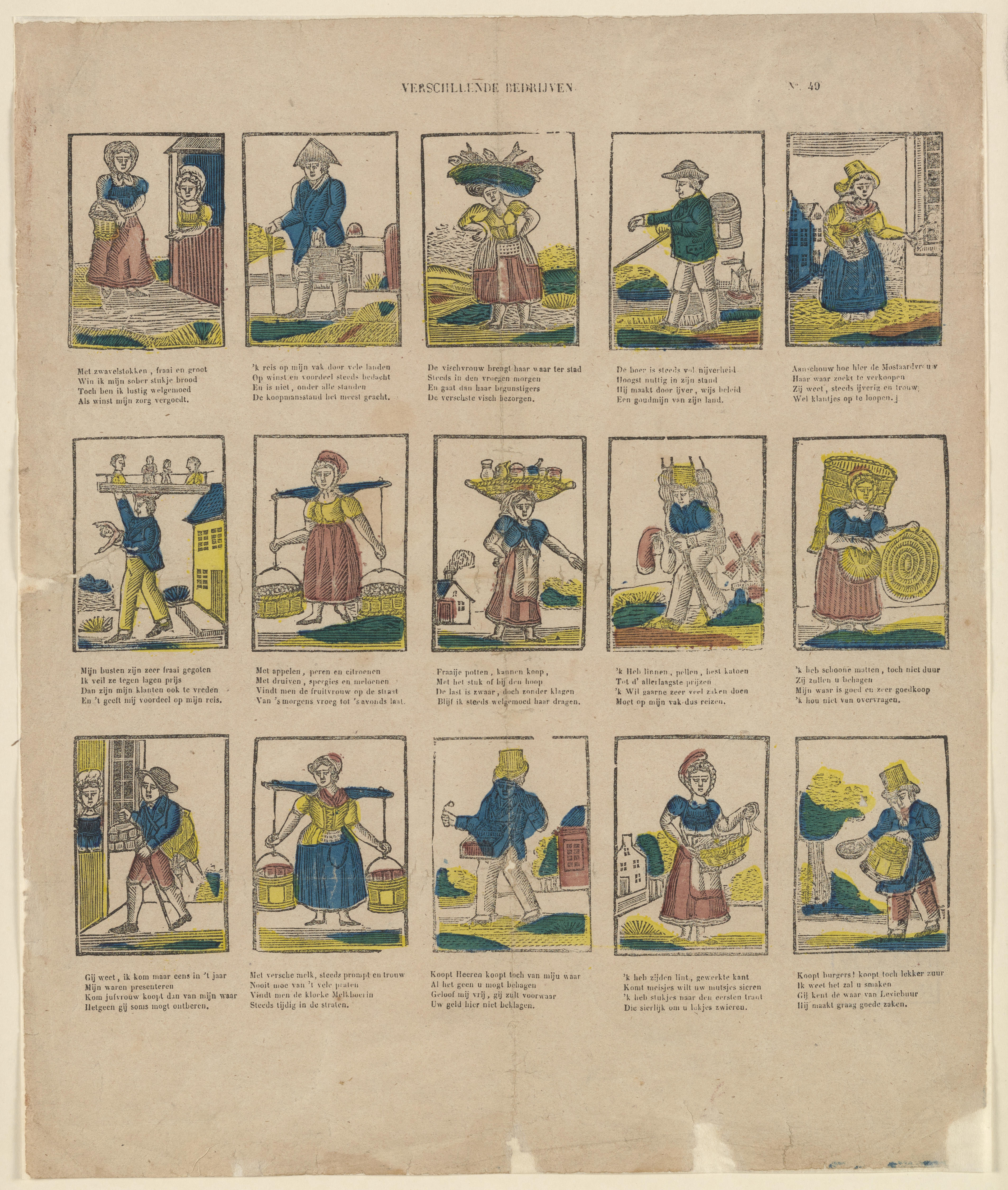 Onderwijsprent met allerlei bezigheden. - V.