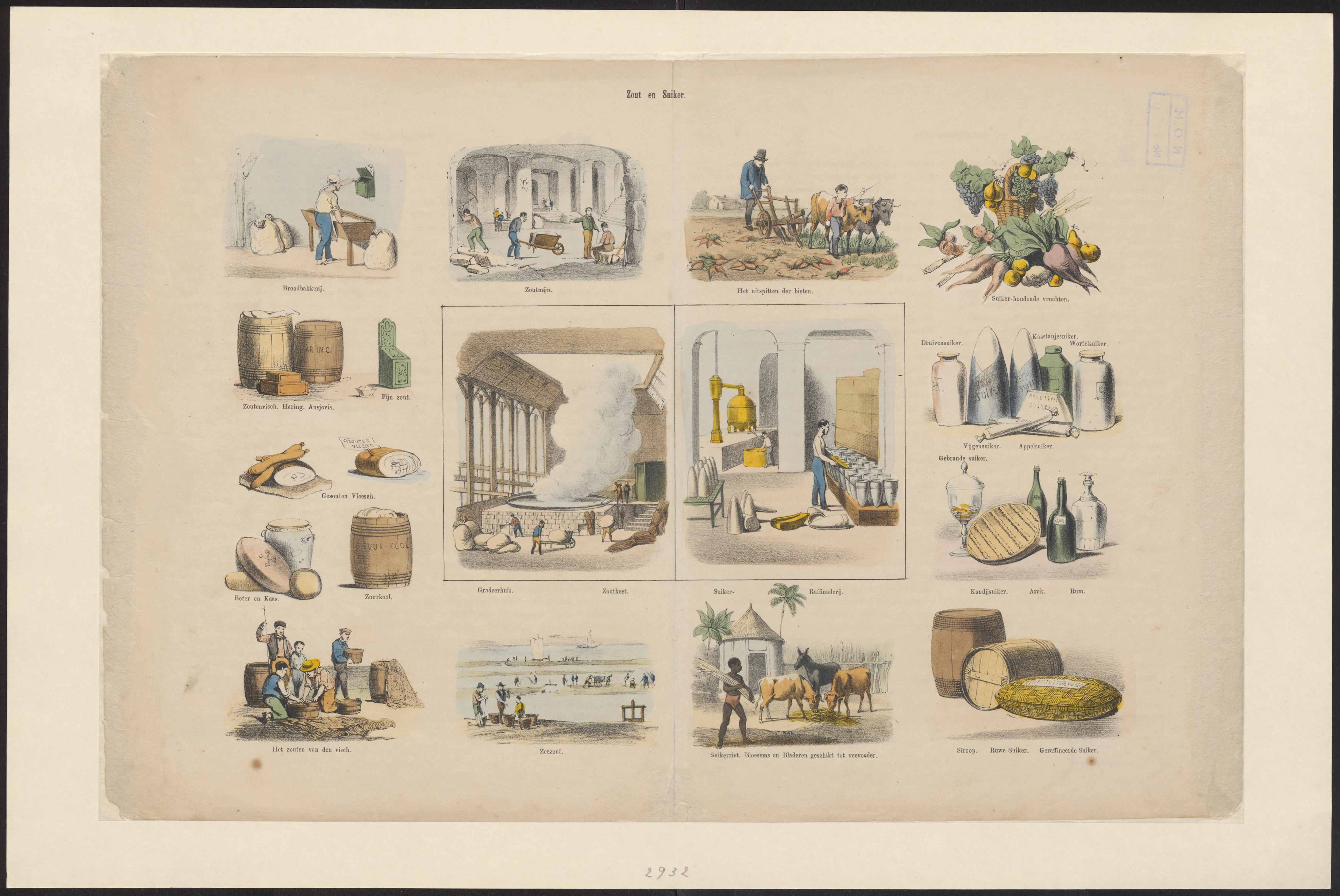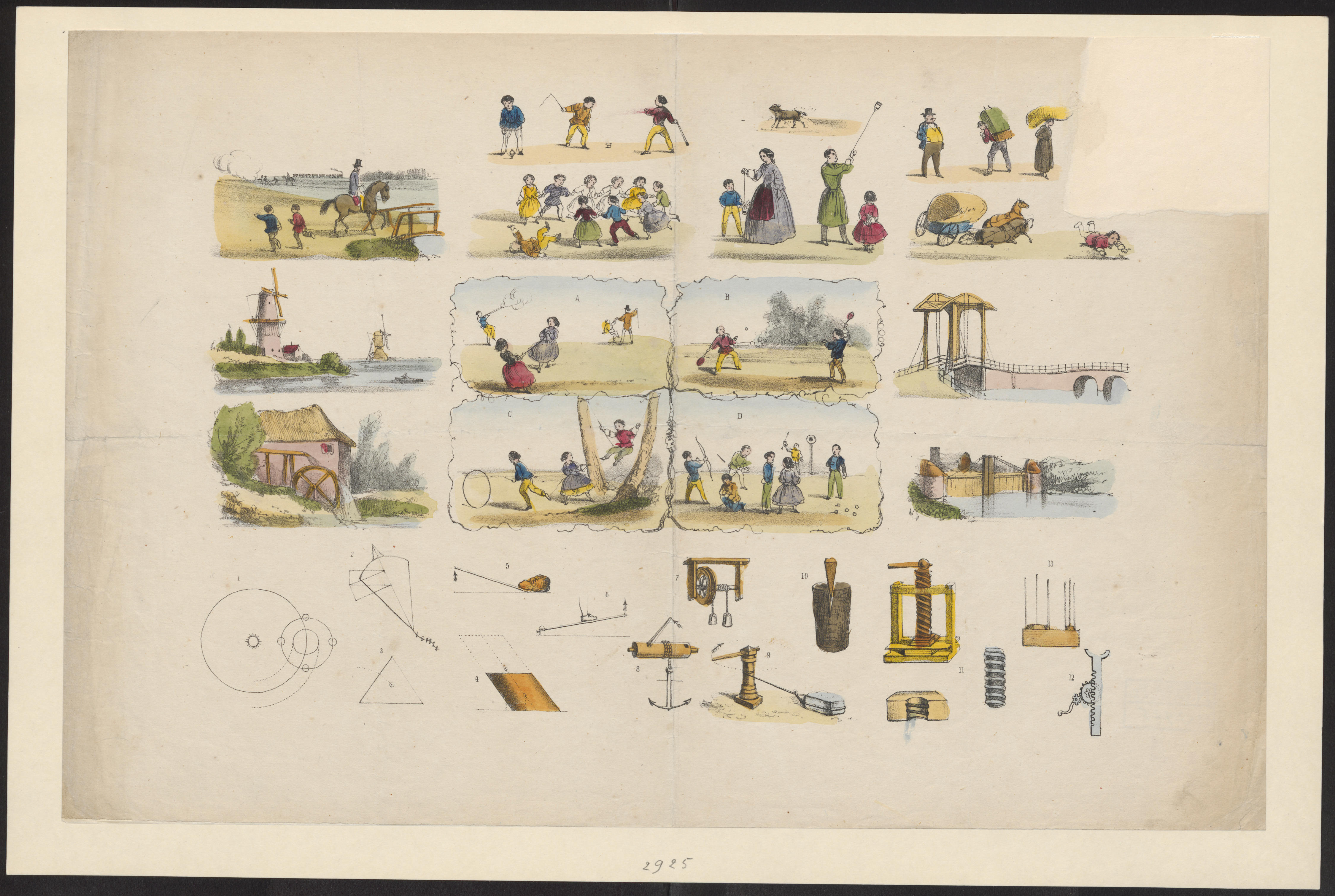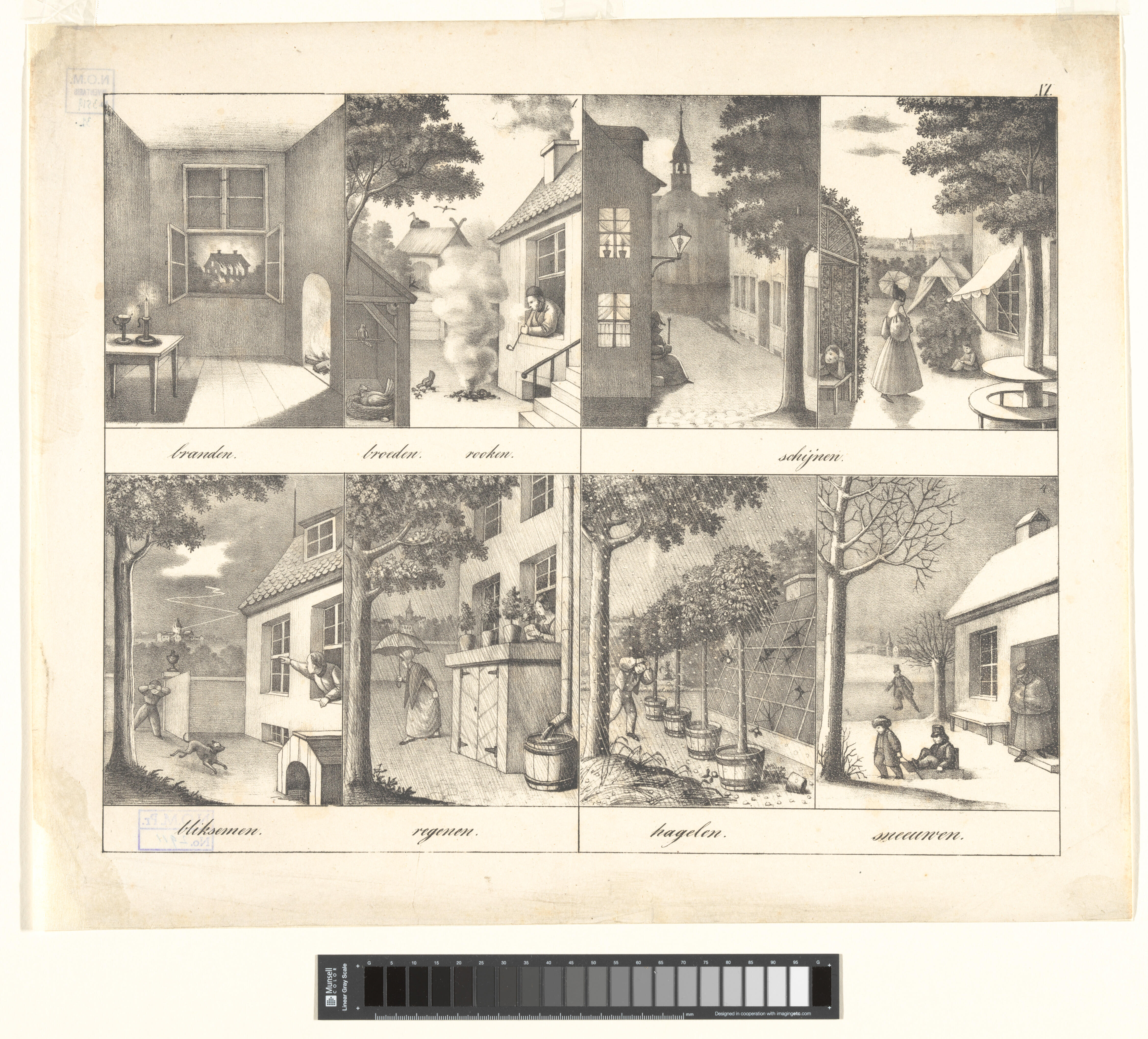 Onderwijsprent met allerlei bezigheden. - X.