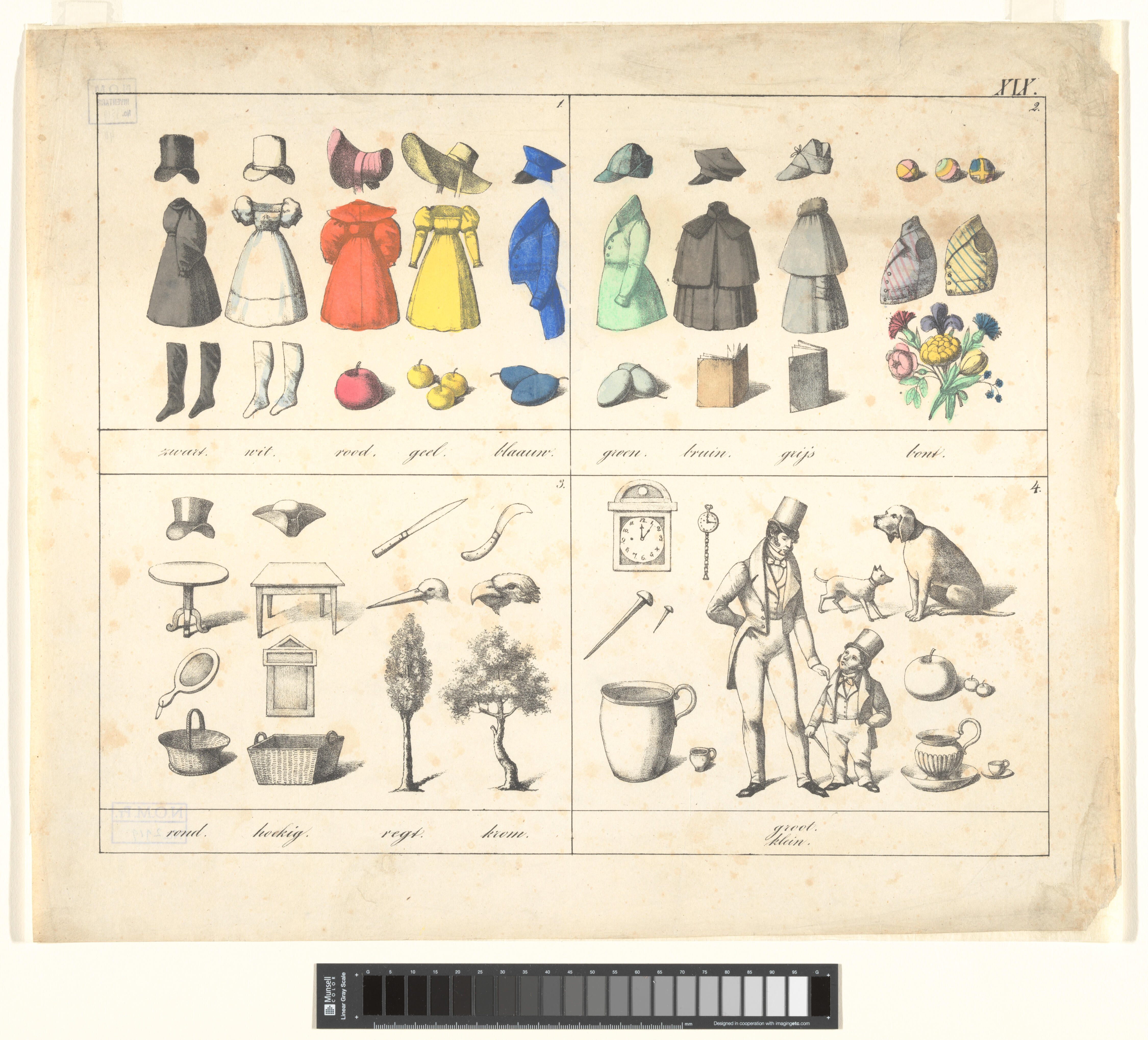 Onderwijsprent met kleuren, vormen en formaten. - XIX.