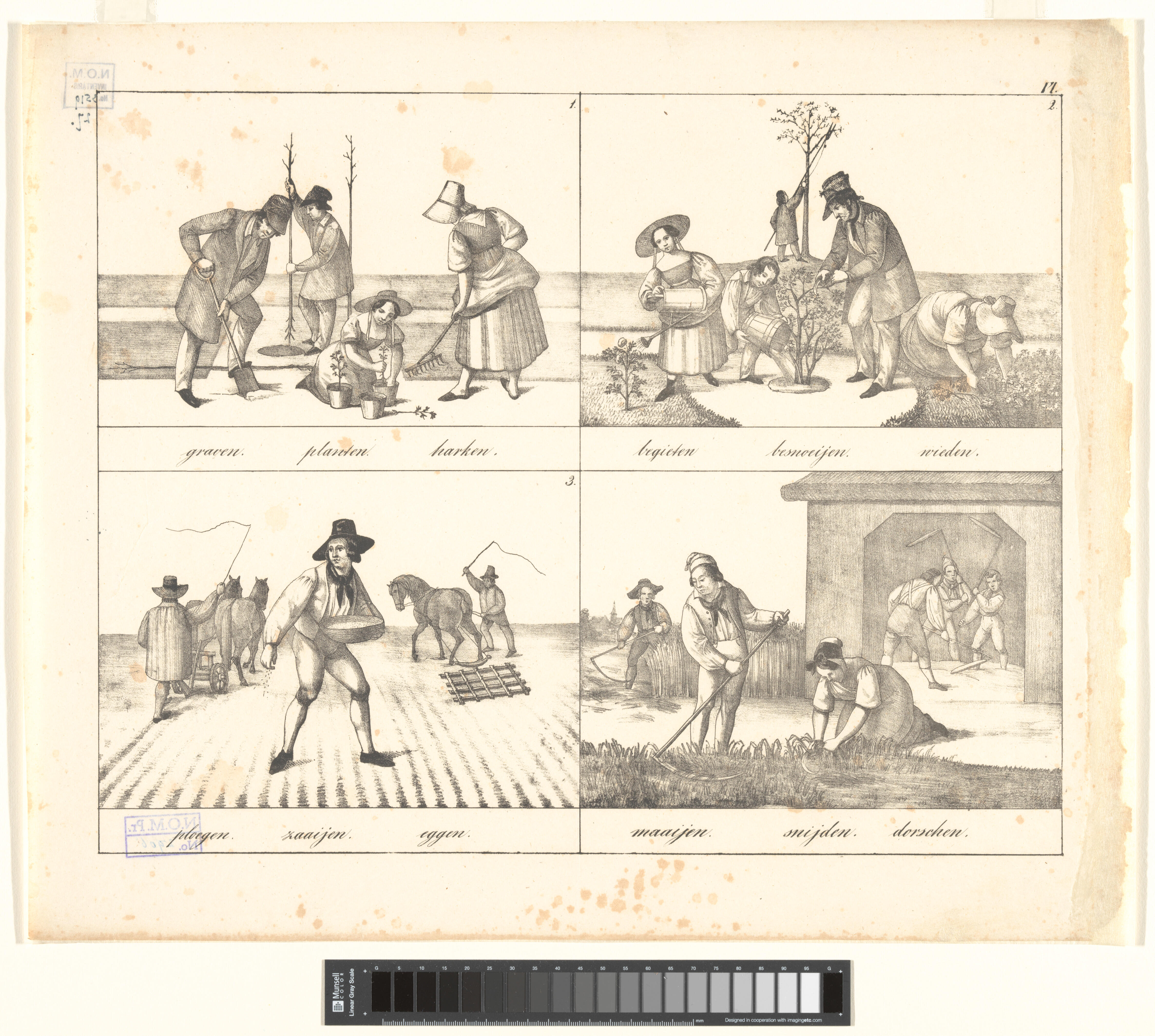 Onderwijsprent met allerlei werkzaamheden. - VI.