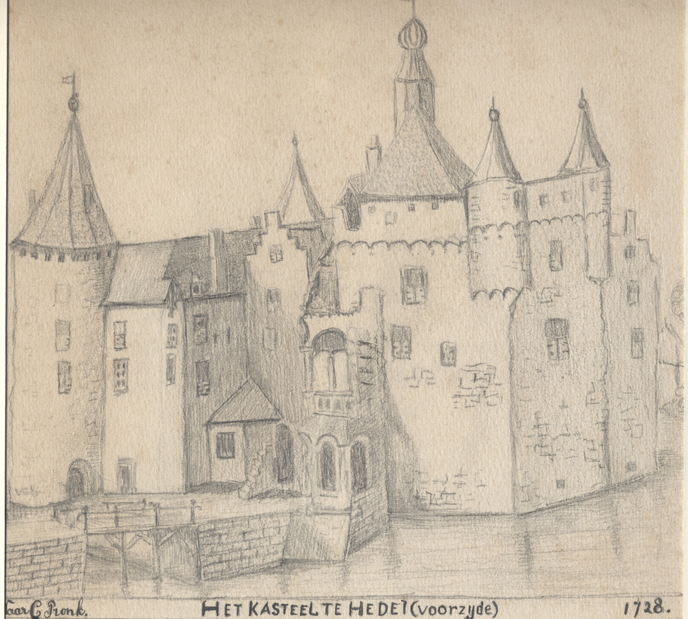 Gezicht op de voorzijde van kasteel Hedel met torens...