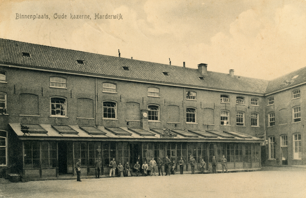 Prentbriefkaart, getiteld 'Binnenplaats, Oude kazern...