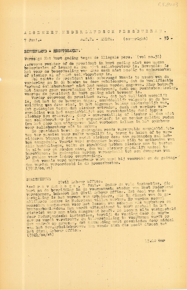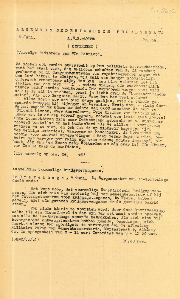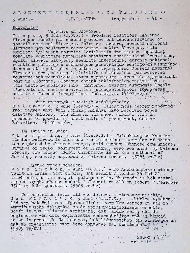 Algemeen Nederlandsch Persbureau, mededelingen, 3 ju...