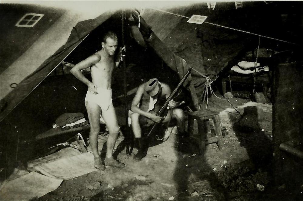 Foto van groep mannen in barak.