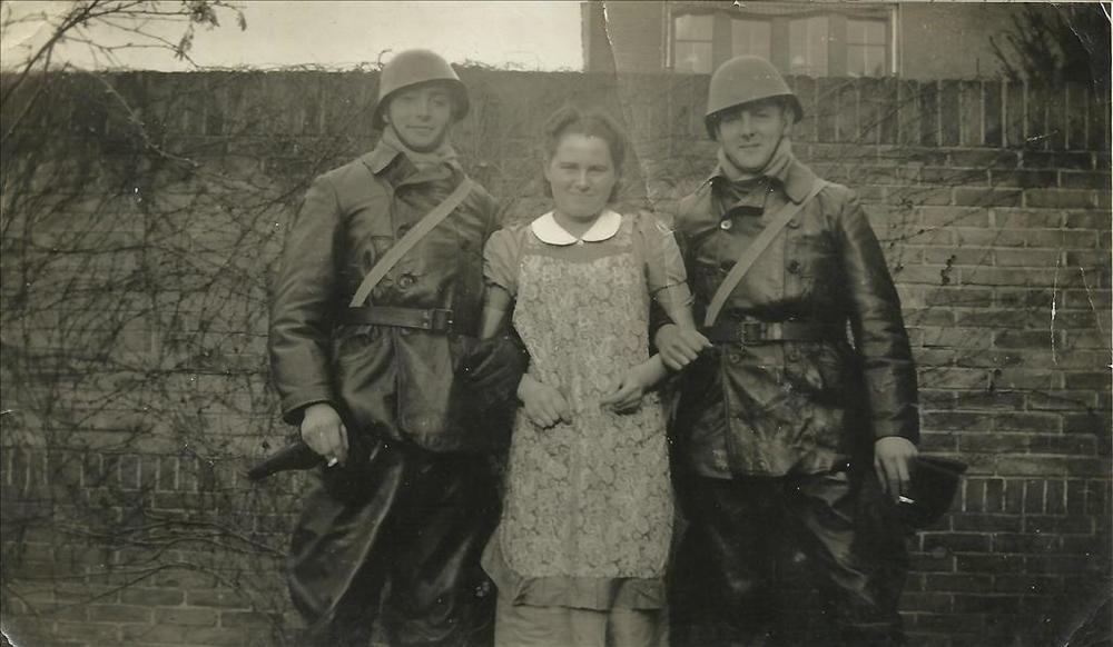 Nederlandse burger met twee militairen "Hans met 2 C...