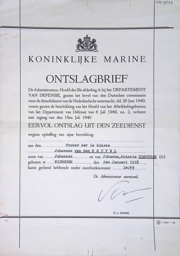Ontslagbrief van Johannes van den Heuvel .
