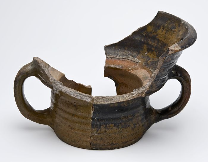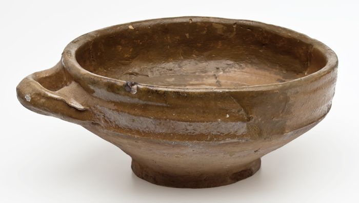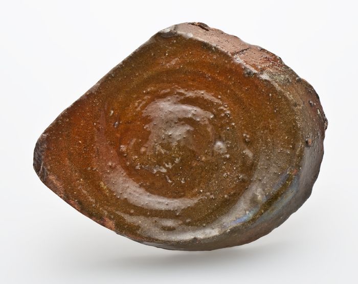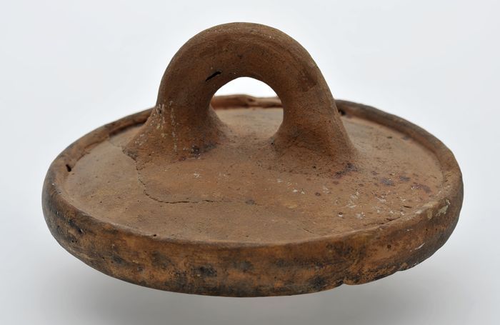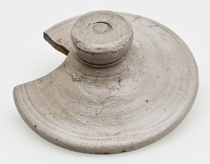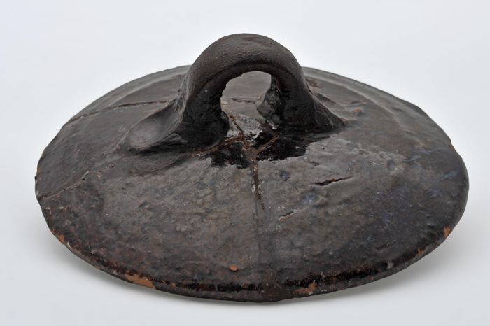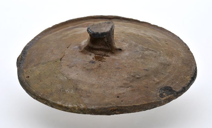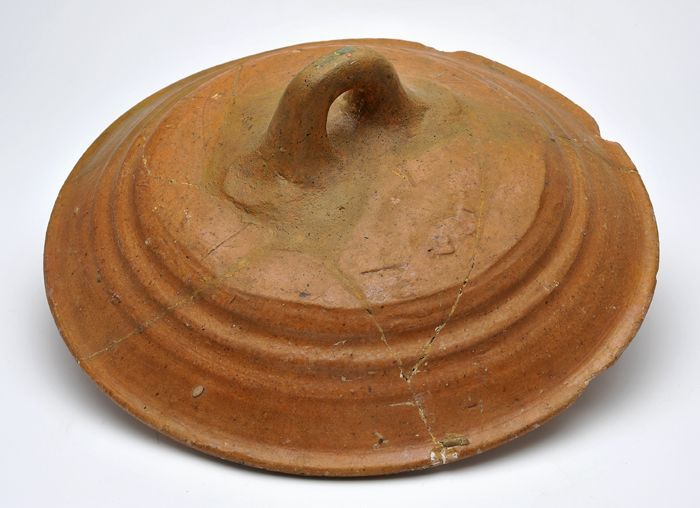 Aardewerk deksel, rode scherf, geglazuurd, draairing...
