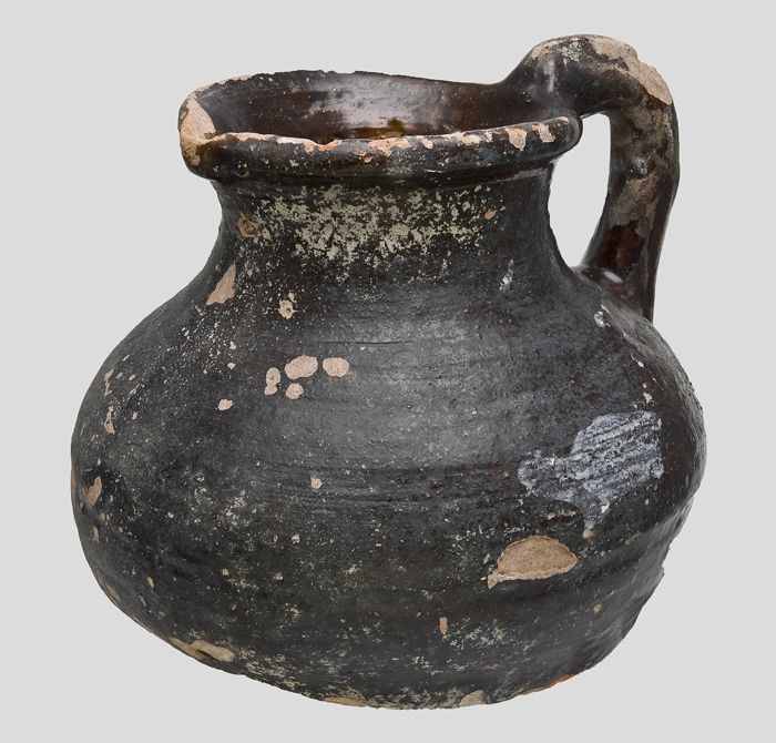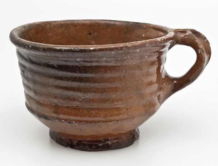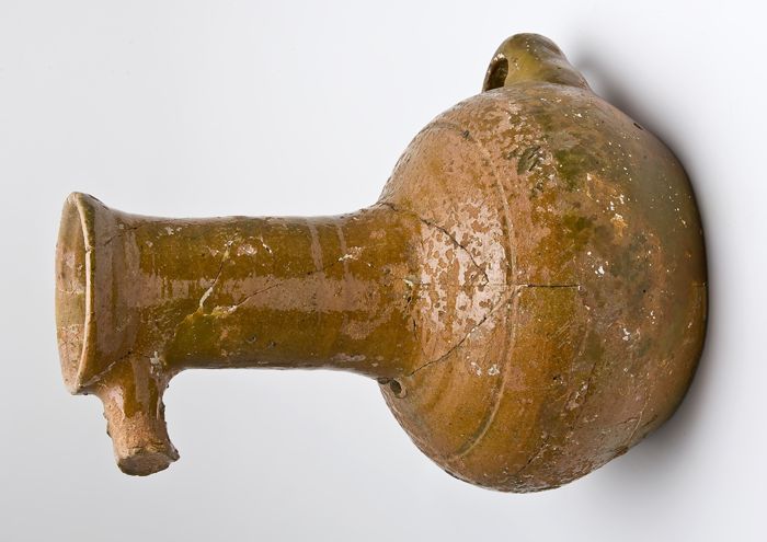 Aardewerk kan met oor, schenktuit, dubbele ingesnede...